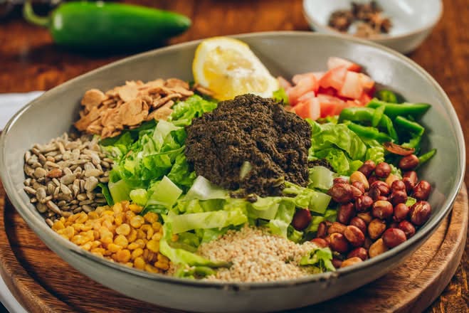 Romaine lettuce, fried yellow beans, garlic chips, sesame & sunflower seeds, peanuts, tomatoes & jalapeños all tossed with fermented green tea leaf dressing