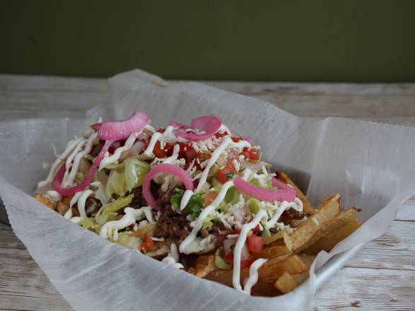 French fries, ground beef, pickled onions, lettuce, pico de gallo, sour cream and fresco cheese