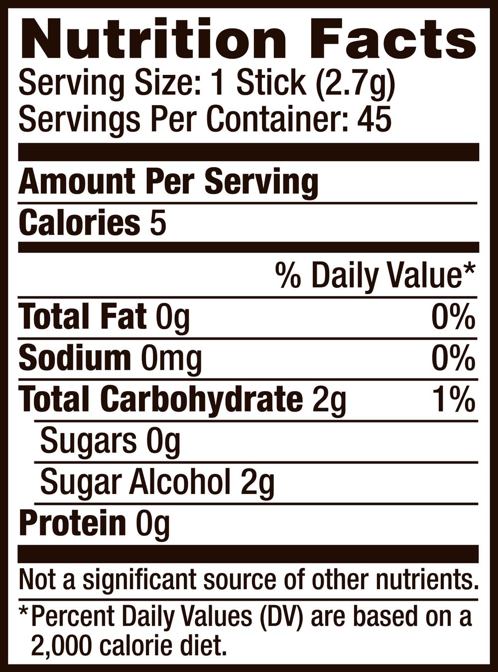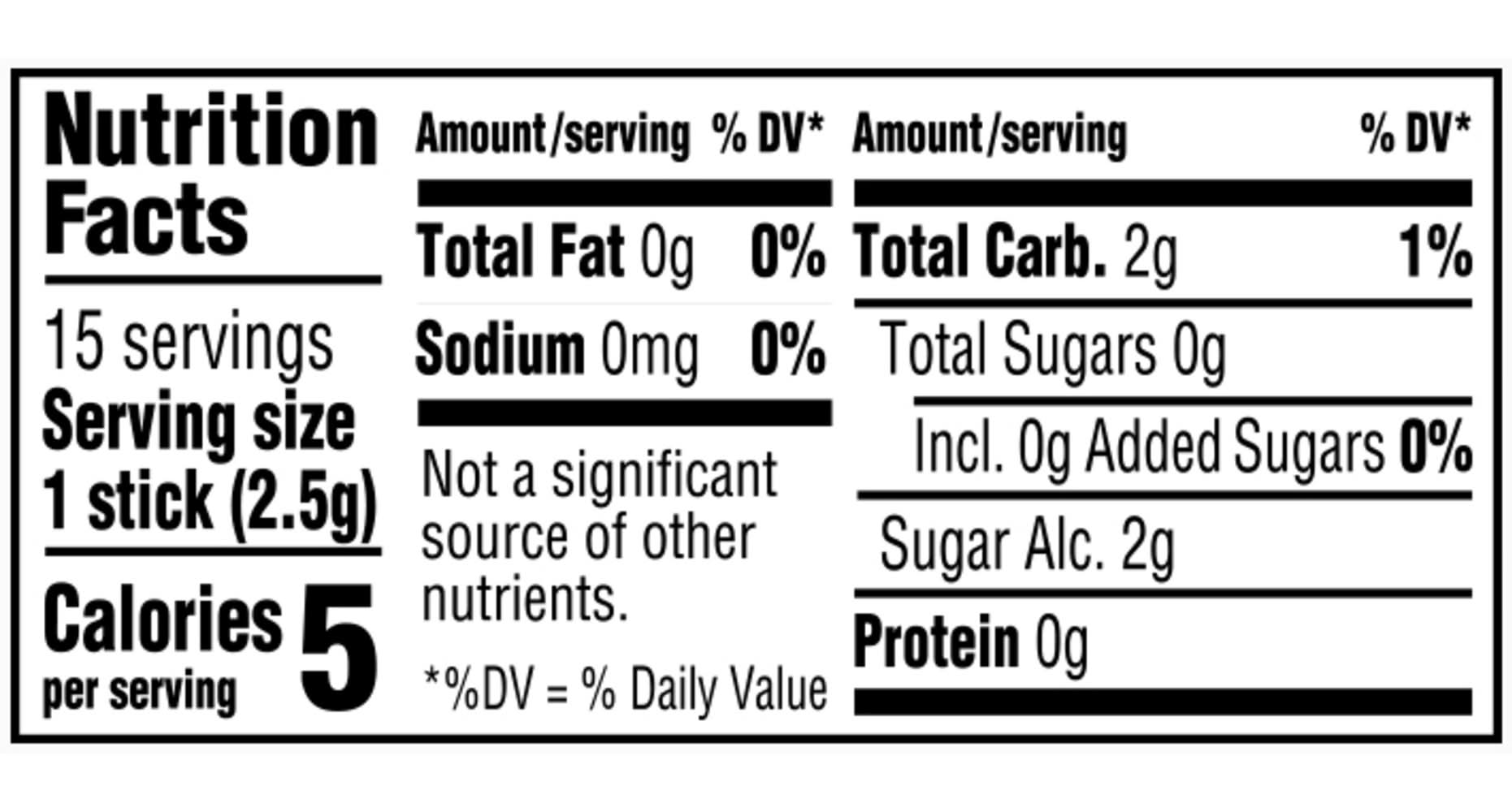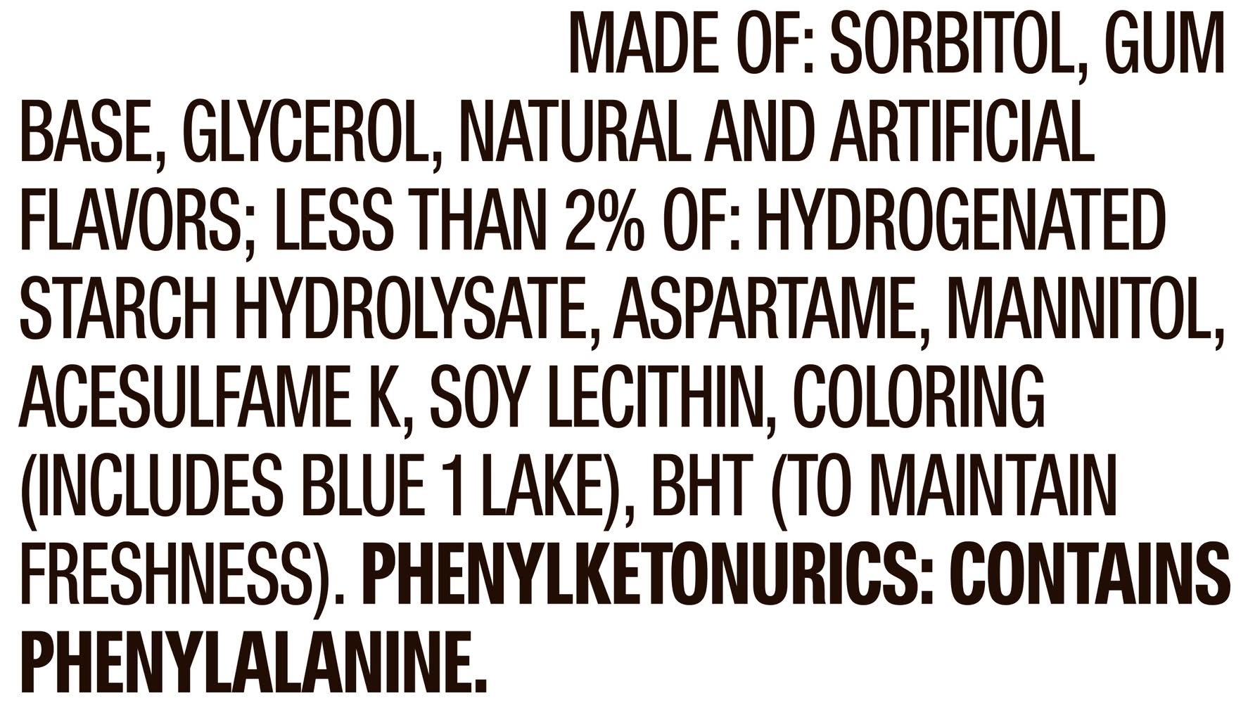 Ingredients: Sorbitol, Gum Base, Glycerol, Natural and Artificial Flavors; Less than 2% of: Hydrogenated Starch Hydrolysate, Aspartame, Mannitol, Acesulfame K, Soy Lecithin, Coloring (Includes Blue 1 Lake), BHT (to Maintain Freshness). Contains: 'Contains Soybeans'
