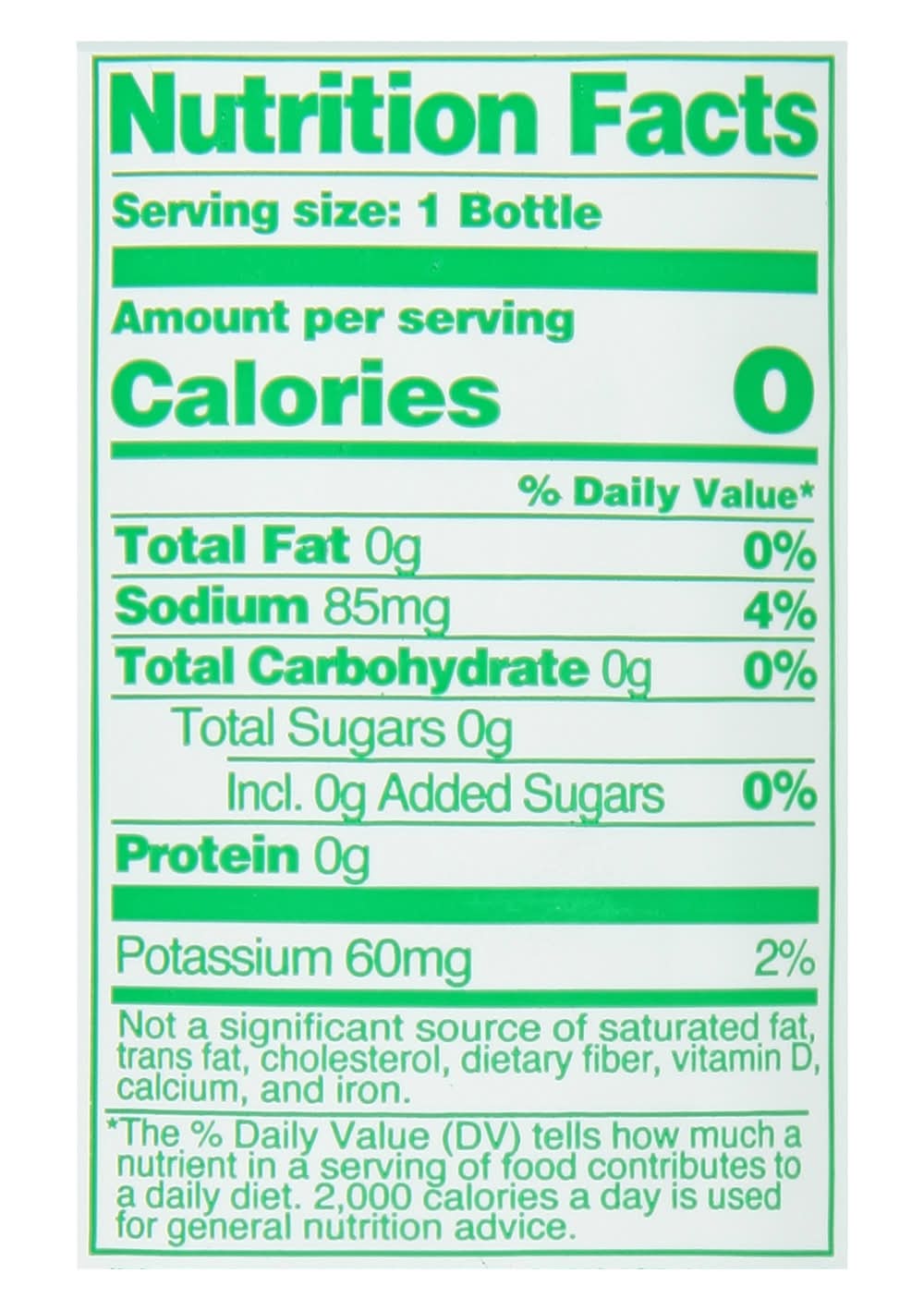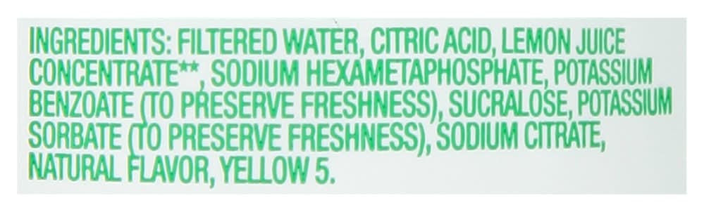 Ingredients: Filtered Water, Citric Acid, Lemon Juice Concentrate (Adds a Dietarily Insignificant Amount of Sugar), Sodium Hexametaphosphate, Potassium Benzoate (to Preserve Freshness), Sucralose, Potassium Sorbate (to Preserve Freshness), Sodium Citrate, Natural Flavor, Yellow 5