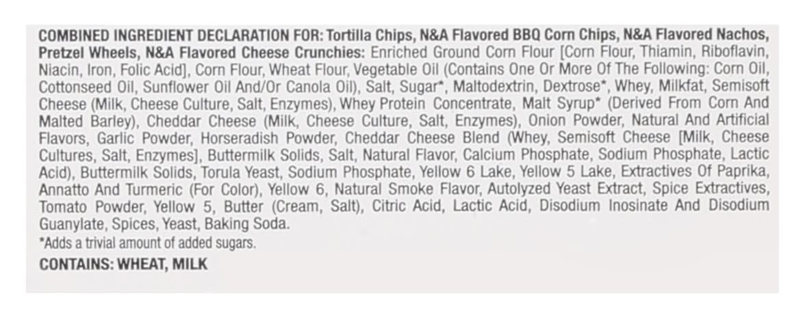 Ingredients: Combined Ingredient Declaration for: Tortilla Chips, N&A Flavored BBQ Corn Chips, N&A Flavored Nachos, Pretzel Wheels, N&A Flavored Cheese Crunchies: Enriched Ground Corn Flour [Corn Flour, Thiamin, Riboflavin, Niacin, Iron, Folic Acid], Corn Flour, Wheat Flour Vegetable Oil (Contains One or More of the Following: Corn Oil, Cottonseed Oil, Sunflower Oil and/Oil), Salt, Sugar*, Maltodextrin, Dextrose*, Whey, Milkfat, Semisoft Cheese (Milk, Cheese Culture, Salt, Enzymes), Whey Protein Concentrate, Malt Syrup* (Derived from Corn and Malted Barley), Cheddar Cheese (Milk, Cheese Culture, Salt, Enzymes), Onion Powder, Natural and Artificial Flavor, Garlic Powder, Horseradish Powder, Cheddar Cheese Blend (Whey, Semisoft Cheese [Milk, Cheese Cultures, Salt, Enzymes], Buttermilk Solids, Salt, Natural Flavor, Calcium Phosphate, Sodium Phosphate, Lactic Acid), Buttermilk Solids, Torula Yeast, Sodium Phosphate, Yellow 6 Lake, Yellow 5 Lake, Extractives of Paprika, Annatto and Turmeric (for Color), Yellow 6, Natural Smoke Flavor, Autolyzed Yeast Extract, Spice Extractives, Tomato Powder, Yellow 5, Butter (Cream, Salt), Citric Acid, Lactic Acid, Disodium Inosinate and Disodium Guanylate, Spices, Yeast, Baking Soda. * Adds a Trivial Amount of Added Sugars Contains: Wheat, Milk, Corn, Barley