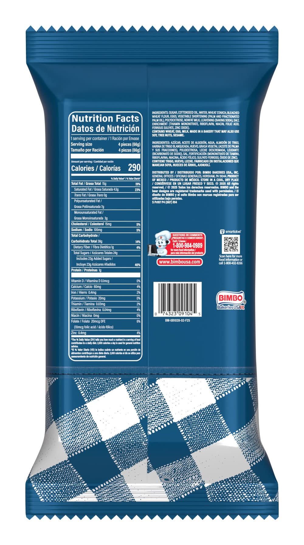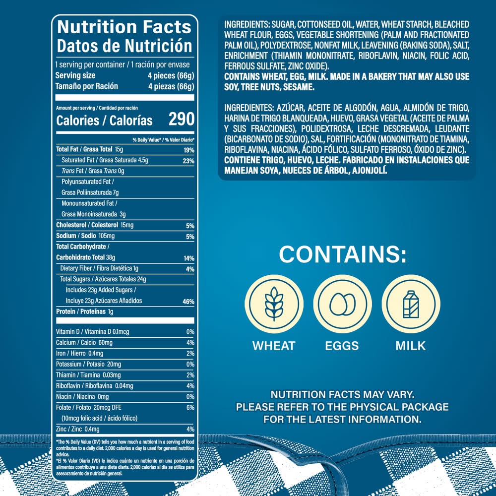Ingredients: SUGAR, COTTONSEED OIL, WATER, WHEAT STARCH, BLEACHED WHEAT FLOUR, EGGS, VEGETABLE SHORTENING (PALM AND FRACTIONATED PALM OIL), POLYDEXTROSE, NONFAT MILK, LEAVENING (BAKING SODA), SALT, ENRICHMENT [THIAMIN MONONITRATE, RIBOFLAVIN, NIACIN, FOLIC ACID, FERROUS SULFATE, ZINC OXIDE], . Contains: CONTAINS EGG, MILK, WHEAT.