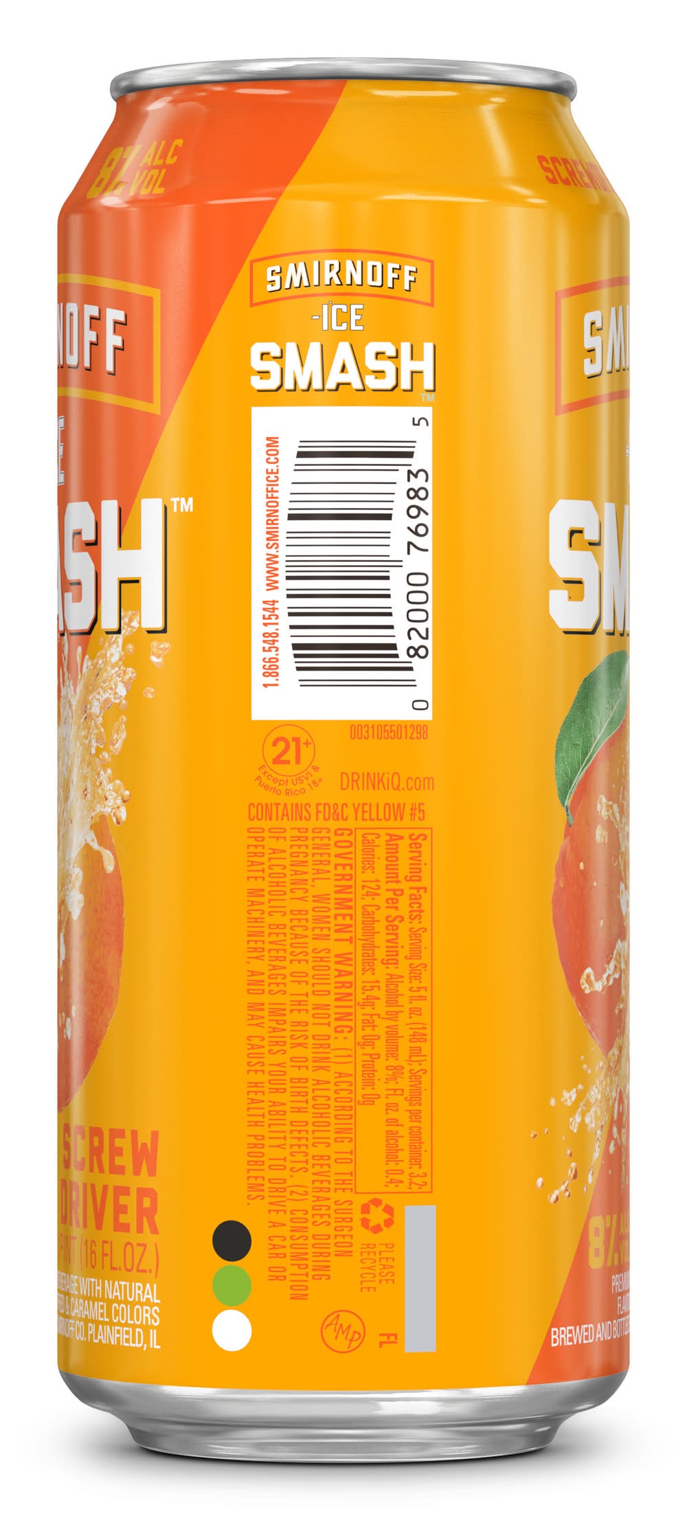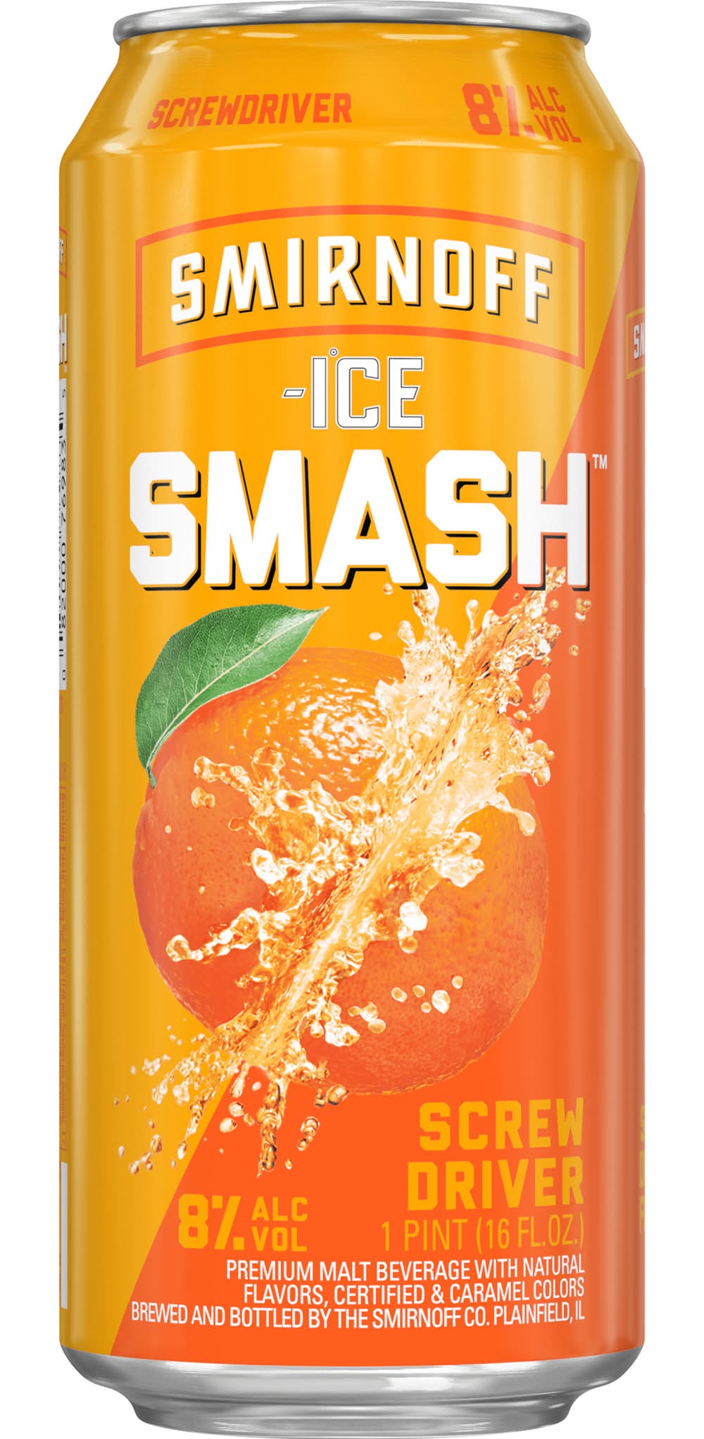 Smirnoff Ice Smash Screwdriver features a bold fusion of orange citrus flavor. Lightly carbonated with a refreshing flavor and 8% ABV, Smirnoff Ice Smash Screwdriver is great for parties, barbecues and picnics or a casual evening with friends. One of the most popular malt beverages in the nation, Smirnoff Ice has been a staple of get-togethers and parties since 1999. Please drink responsibly. • Alcohol by volume: 8% • Packaging: Reusable