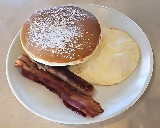 2 eggs, 2 strips of the bacon sausage link, served with small orange juice