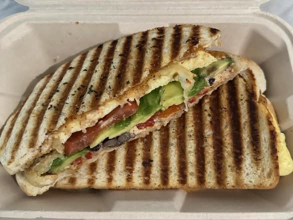 Vegetarian. Black beans, chipotle sauce, tomato, roasted peppers, avocado slices, scrambled eggs, pepper-jack cheese.