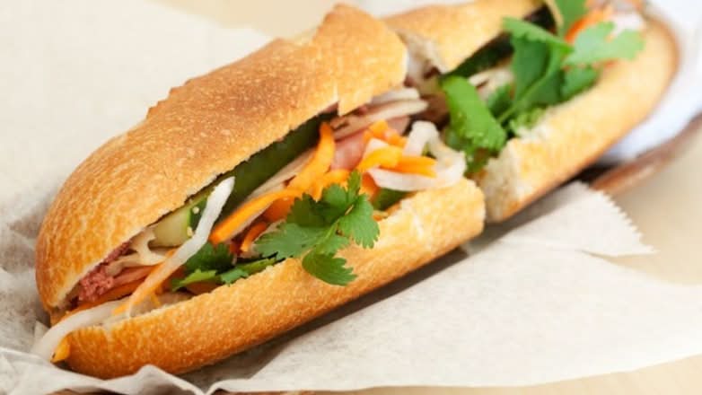 pickled daikon & carrots, cucumbers, cilantro, jalapeños, house garlic mayo, light soy sauce, and black pepper on a fresh French baguette