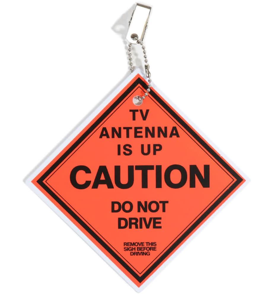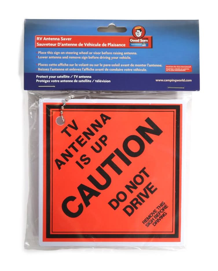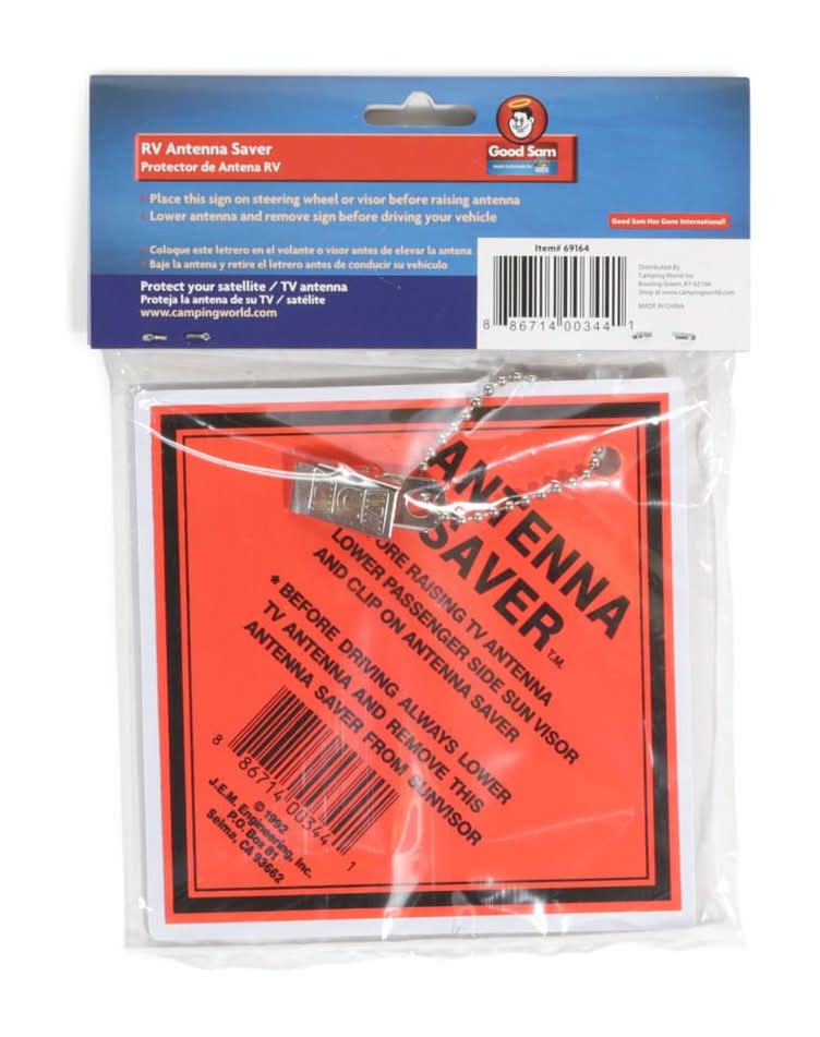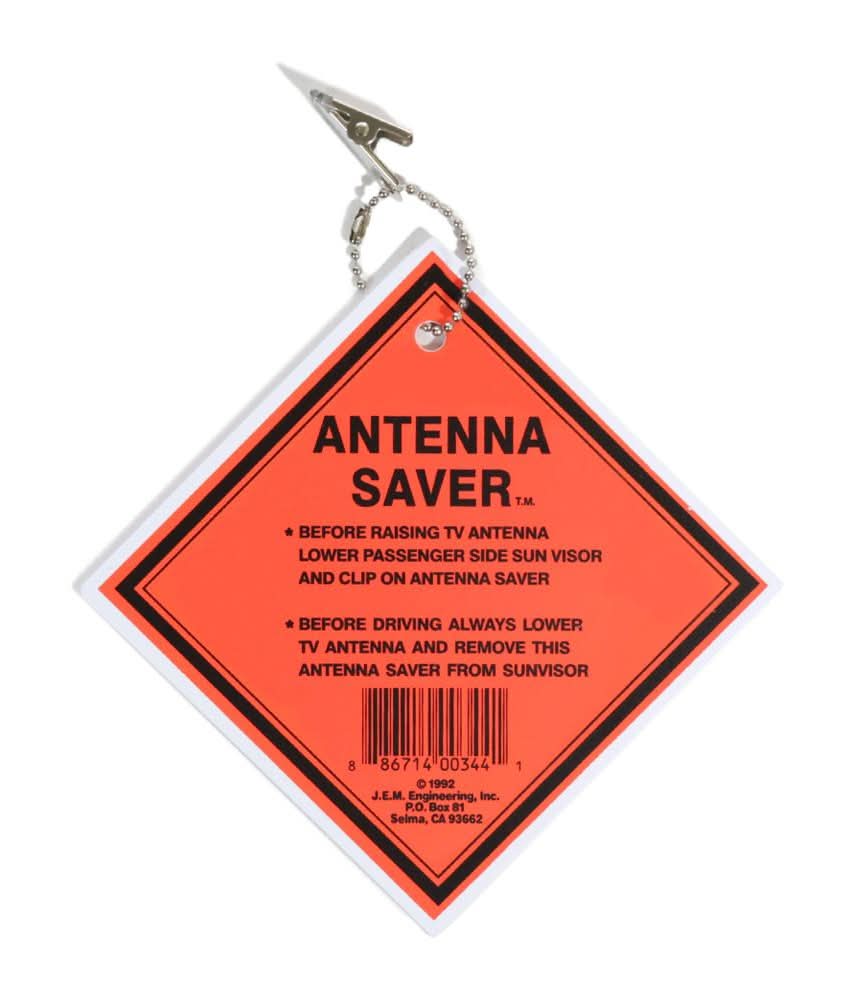 Bright Orange clip-on sign reminds you to LOWER YOUR ANTENNA before it's too late! Clips onto sun visor. Made of heavy-gauge plastic with steel chain and clip. USA. | Venture Forward Antenna Saver in Orange