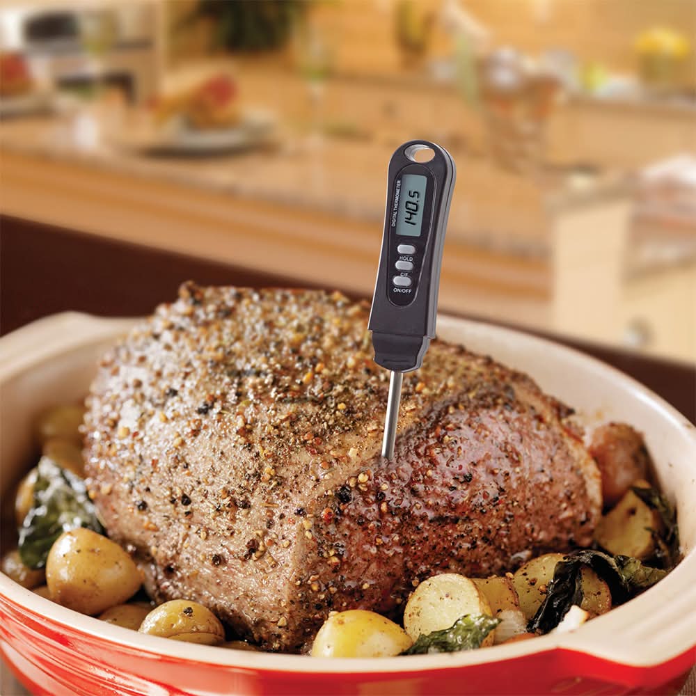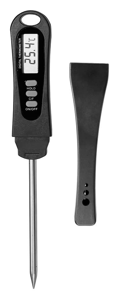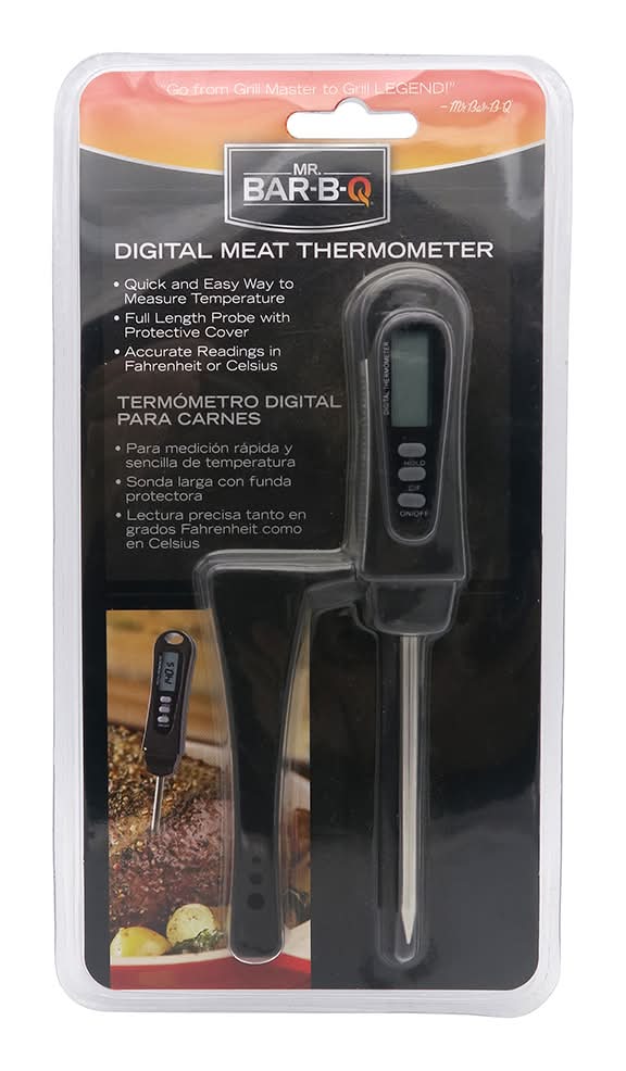 Cook your meats to just the right temperature with the Mr. Bar-B-Q Digital Meat Thermometer. With just the push of a button, you'll get quick, easy, and accurate temperature readings every time, in either Fahrenheit or Celsius. Full-length probe. Protective cover included. Accurate readings in Fahrenheit or Celsius Full-length probe Protective cover included | Mr Bar-B-Q Mr. Bar-B-Q Digital Meat Thermometer
