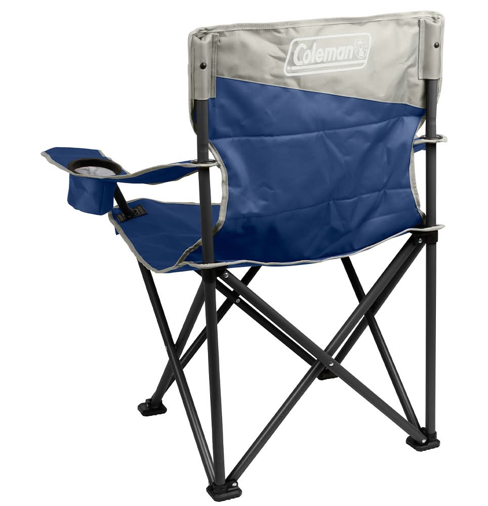 The robust Coleman Big & Tall Quad Chair won't let you down. This strong, oversized steel frame supports up to 600 lbs. and delivers custom comfort for big and tall campers, sideline champs with kids on their laps, tailgaters, and more. Large feet help to prevent tipping, and it's loaded with premium details. The handy side pocket is ideal for stashing smaller items like your phone, sunglasses, car keys, wallet, sunscreen, or insect repellent. If a downpour occurs overnight, the seat drains instead of holding water. Constructed from durable polyester fabric, the matching case with shoulder strap offers hands-free transport. • Extra seat space offers custom comfort• Large feet prevent tipping• Innovative stay-dry seat drain releases rainwater and spills• Handy side pocket is ideal for keys, phones, and other essentials• Rugged steel frame supports up to 600 lbs.• Tough polyester fabric boasts classic Coleman colors• Shoulder strap bag offers hands-free convenience• Armrest drink holder keeps refreshing drinks securely within reach• Seat width: 24"• Seat height: 19"• Folded: 38.6" x 6.7" x 7.6"• Weight: 11.25" Large feet help to prevent tipping Handy side pocket is ideal for stashing smaller items Matching case with shoulder strap for hands-free transport | Coleman Big & Tall Quad Camping Chair