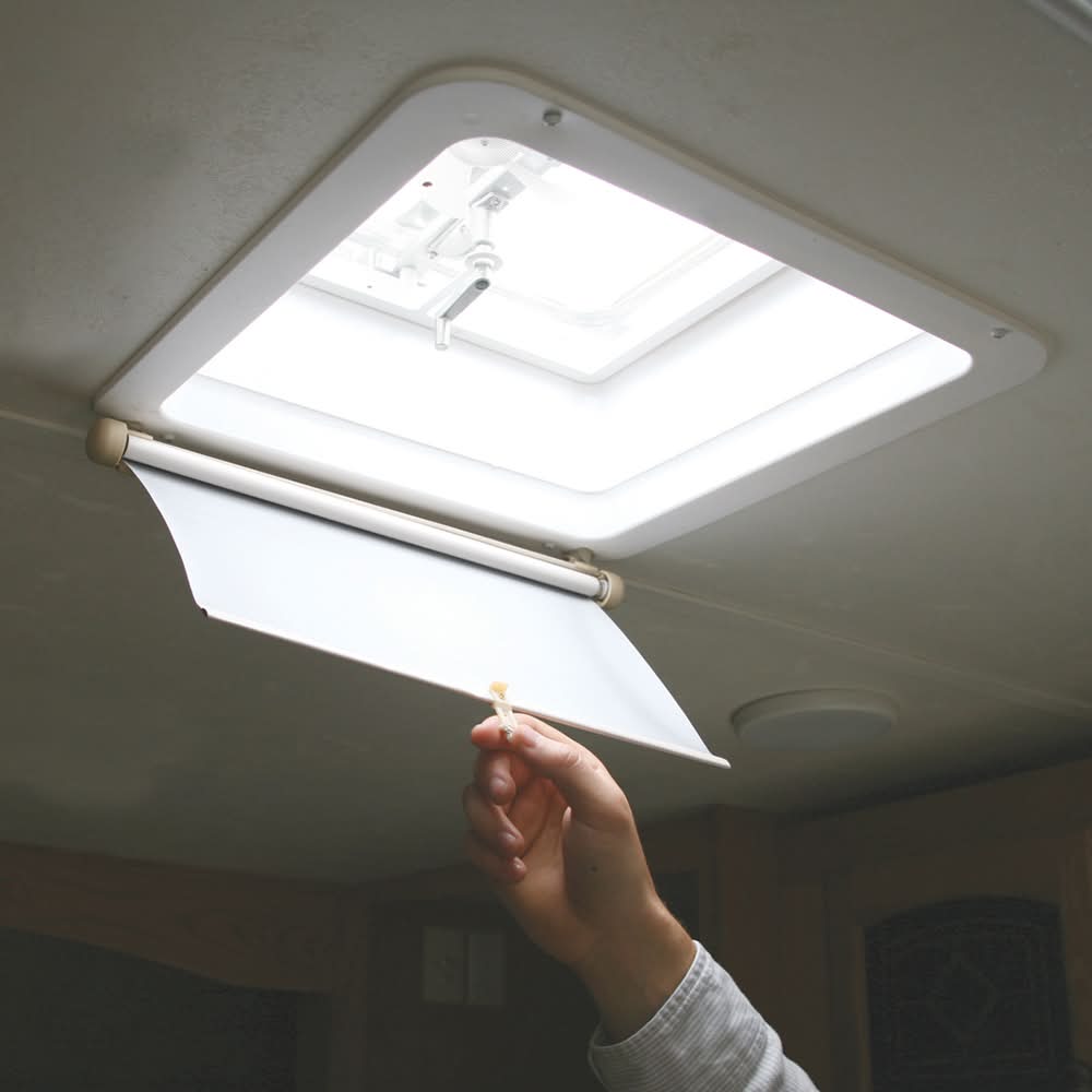 The Camco Lights Out Retractable RV Vent Shade blocks out sunlight, moonlight, and streetlights from your RV's ceiling vent. It easily mounts to the ceiling and retracts into a space-efficient housing to allow light inside during the day. Opens to 14-1/8"W x 19"L. The vent shade is constructed of solid vinyl and weighs 5.5 oz. It's cream colored to match most RV interiors. The reflective finish reflects heat to keep your RV cool. Mounting materials provided.• Blocks sunlight, moonlight, and streetlights• Easily retracts into a space-efficient housing to let light in during the day• Opens to 14-1/8"W x 19"L• Easily mounts to the ceiling with included hardware• Constructed of solid vinyl• Weighs just 5.5 oz.• Reflective finish reflects heat to keep your RV cool Shade retracts into housing to allow light inside during the day Constructed of solid vinyl Opens to 14-1/8"" x 19"" | Camco Lights Out Retractable RV Vent Shade, Cream