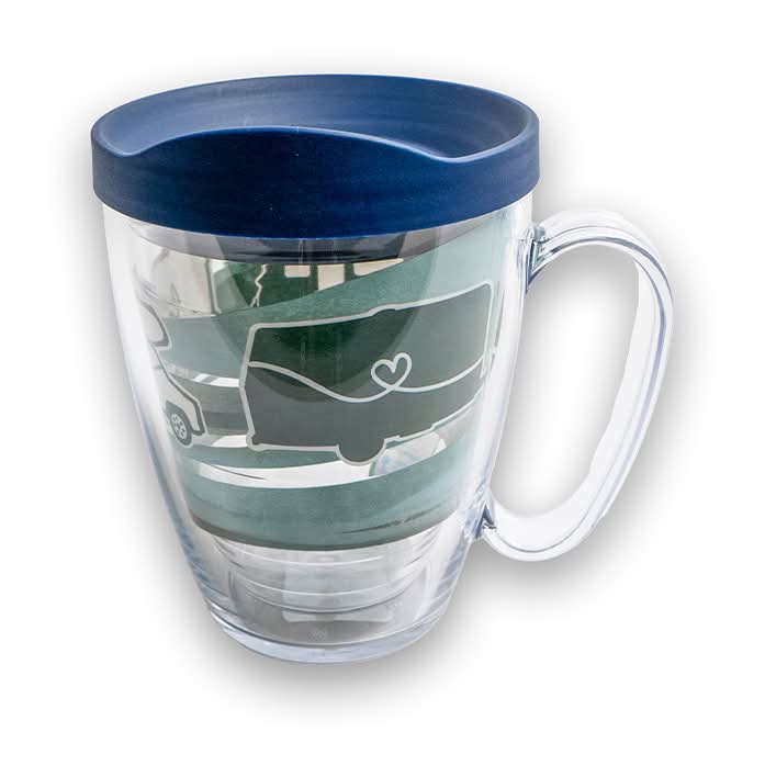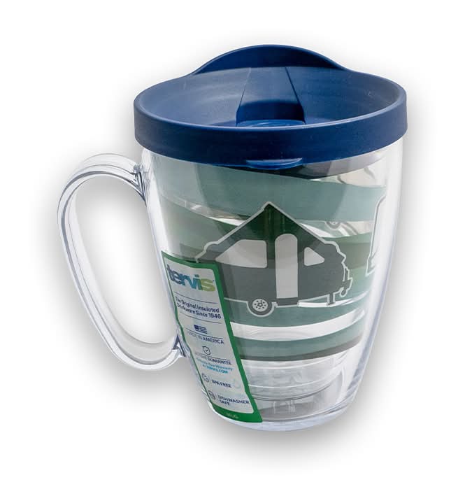 Tervis Insulated Drinkware delivers the ultimate combination of personality and performance for pure drinking enjoyment. Each classic tumbler is proudly made in America and backed with a Lifetime Guarantee. The Tervis Mug features a comfortable, easy-to-grip handle and double-wall insulated construction that keeps drinks hot or cold longer and reduces condensation to prevent rings on your table. Strong, impact-resistant BPA-free material means this mug can take a tumble without shattering and won't retain tastes or odors. The mug is microwave, freezer, and dishwasher safe for no-worry convenience.• Printed wraparound design is sealed between the tumbler walls• Double-wall insulated construction keeps drinks hot or cold longer• Reduces condensation to prevent rings on your table• Comfortable, easy-to-grip handle• Strong, impact-resistant BPA-free material• Won't retain tastes or odors• Comes with an easy-to-clean BPA-free travel lid• Microwave, freezer, and dishwasher safe for no-worry convenience• Proudly made in America• Backed by a Lifetime GuaranteeSpecsCapacity: 16 oz. Height: 4.9" tallDiameter: 3.9" at top / 2.8" at bottom Strong, impact-resistant BPA-free material won't retain tastes or odors Microwave, freezer, & dishwasher safe Comes with an easy-to-clean BPA-free travel lid | Tervis Insulated 16- oz Mug, Home Sweet Camper with Navy Travel Lid