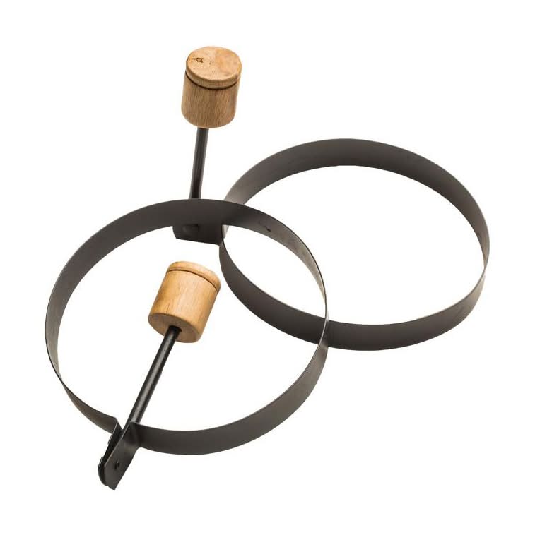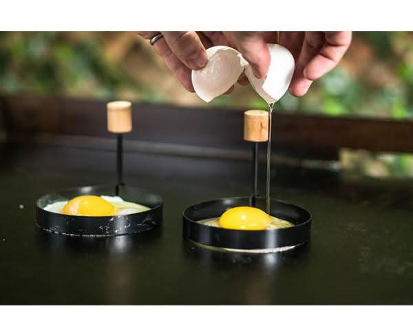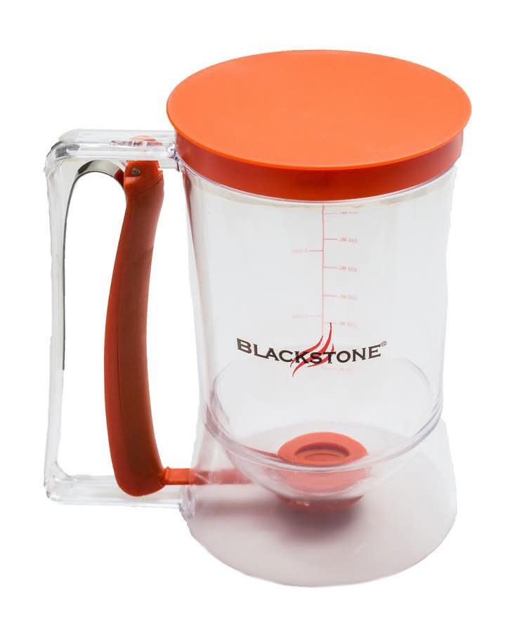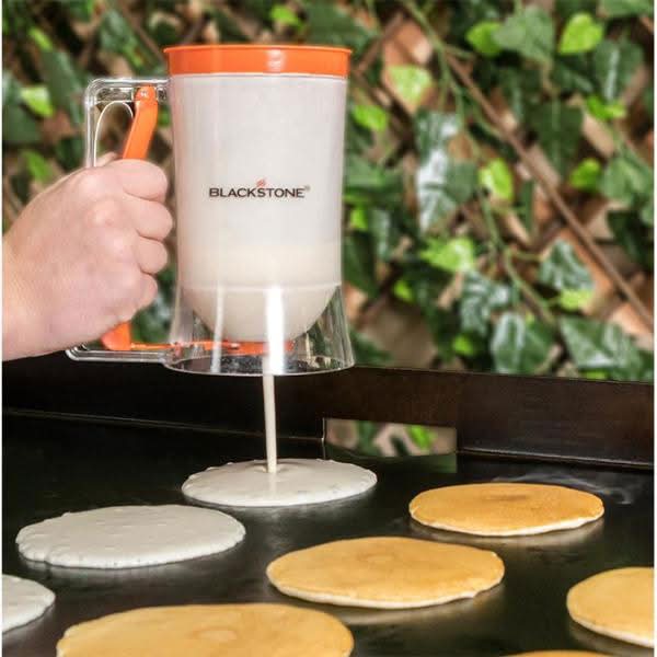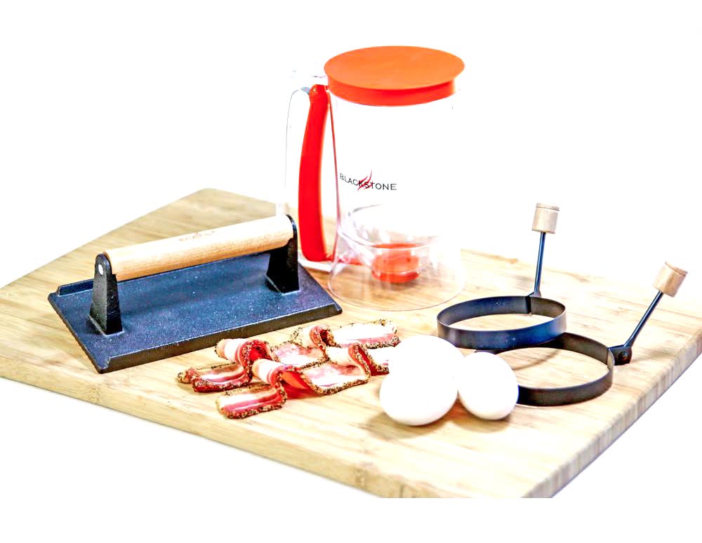 The Blackstone Breakfast Kit is the most convenient way to do breakfast on the griddle! Kit includes a pre-seasoned bacon press, two steel rings, and a 4-cup batter dispenser. The Blackstone batter dispenser holds up to 4 cups of batter and is easy to use for perfect pancakes, cupcakes, muffins, etc. The Blackstone bacon press is made of pre-seasoned cast iron which provides even heating as well as retention, eliminating hot spots. Excellent for making grilled sandwiches on the griddle. 4" diameter egg rings for making eggs and pancakes. These have a wooden knob handle that fold for easy pick up and storage. This kit saves time, dishes, and helps makes you look like a pro at making breakfast! Make delicious pancakes, eggs, grilled sandwiches | Blackstone 4-Piece Breakfast Kit