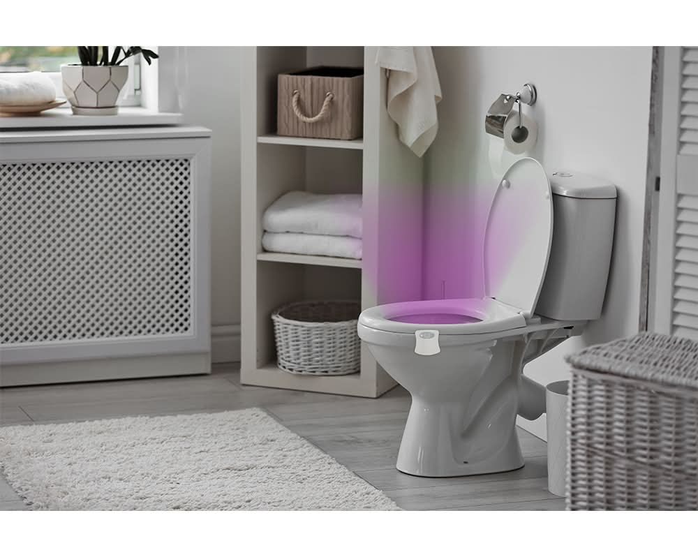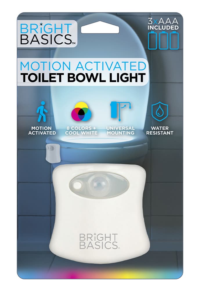 The Bright Basics Motion-Activated Toilet Bowl Light gives you bright lighting to help you find the toilet in the middle of the night. Eight color LEDs give off a color or cool white glow. Activate the motion sensor to turn the lights ON/OFF. The light mounts easily with the universal flexible arm so you don't need any tools. The light operates on the included 3 AAA batteries.• Motion-activated• 8 colors and cool white• 2 light modes: select / rotate• Flexible arm fits bowl for universal mounting• Water-resistant• Easy-to-clean• Includes 3 AAA batteries• Dimensions: 2.5" x 2.75" x 2.15" Activate the motion sensor to turn the lights on/off Flexible arm fits bowl for universal mounting Operates on 3 AAA batteries (included) | Camping World Aduro Bright Basics Motion-Activated Toilet Bowl Light in White
