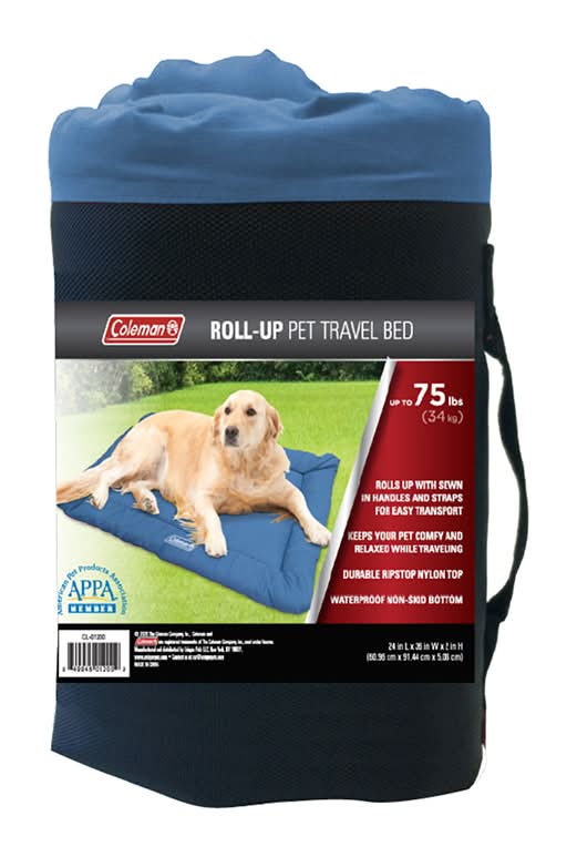 The Coleman Roll-Up Travel Dog Bed is paw-fect whenever you're on the go with your pup. This soft, padded travel bed is suitable for indoor and outdoor use. Pop it in your dog's crate or use it in the back of your SUV to keep your best friend comfy and relaxed while traveling. The bed easily rolls up for space-saving storage or travel. Its waterproof non-skid bottom helps to keep it in place, while the water-resistant ripstop nylon material is extra durable. It's even machine washable for easy cleaning.• Bed easily rolls up for travel or storage• Use it indoors or outdoors, in a crate or in your SUV• Waterproof non-skid bottom keeps the bed from sliding• Water-resistant ripstop nylon is durable• Machine washable for easy cleaning• Measures 24" x 36" x 2" Easily rolls up for space-saving storage or travel Waterproof non-skid bottom helps to keep it in place Water-resistant ripstop nylon is extra durable & machine washable | Coleman Roll-Up Travel Dog Bed, Blue