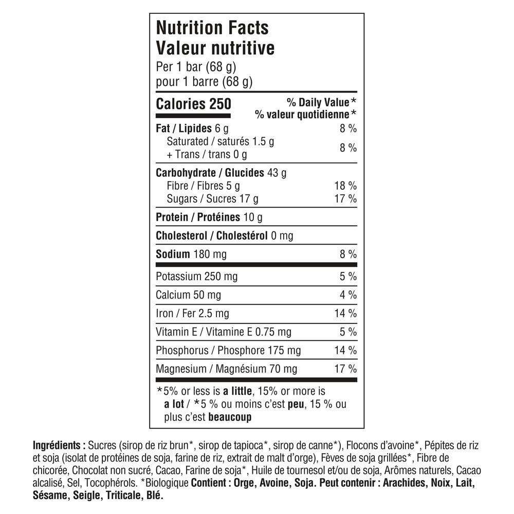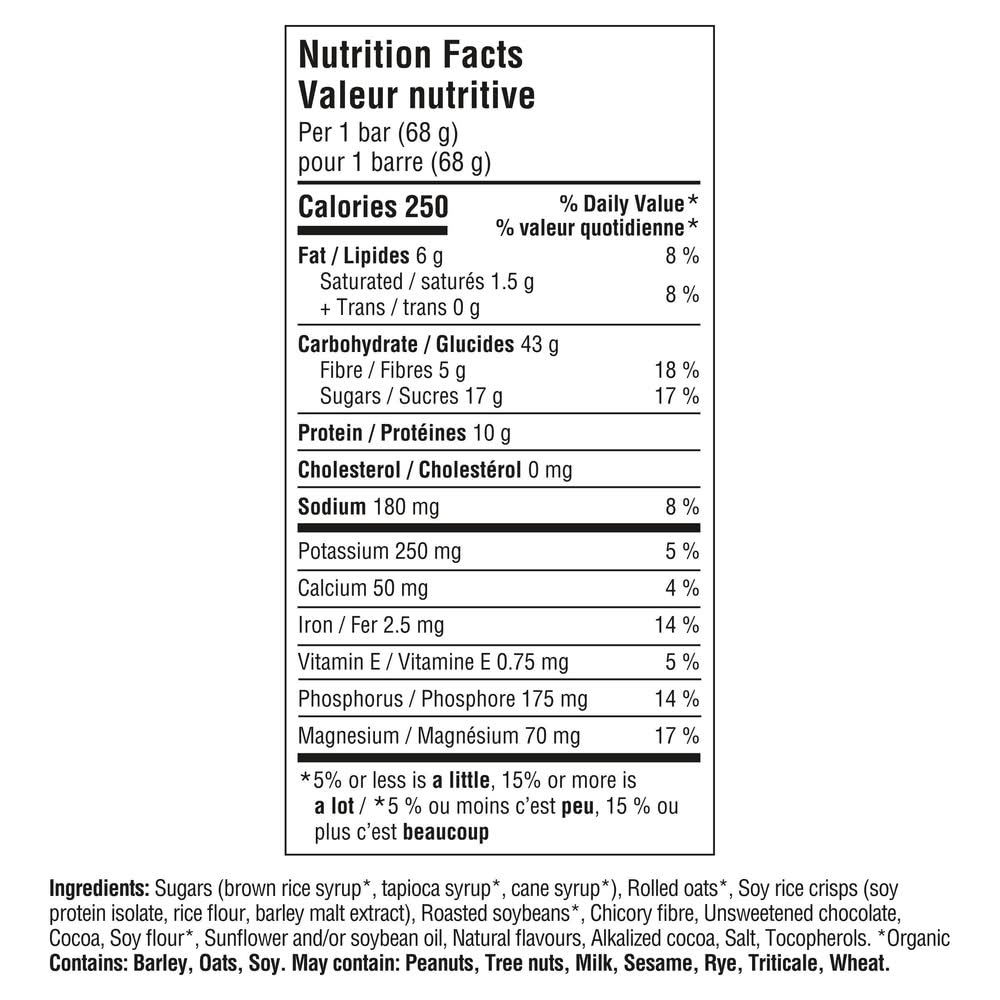 Ingredients: INGREDIENTS: Sugars (brown rice syrup*, tapioca syrup*, cane syrup*), Rolled oats*, Soy rice crisps (soy protein isolate, rice flour, barley malt extract), Roasted soybeans*, Chicory fibre, Unsweetened chocolate, Cocoa, Soy flour*, Sunflower and, or soybean oil, Natural flavours, Alkalized cocoa, Salt, Tocopherols.*OrganicContains: Barley, Oats, Soy.May contain: Peanuts, Tree nuts, Milk, Sesame, Rye, Triticale, Wheat. Contains: Contains: Barley, Oats, Soy.May contain: Peanuts, Tree nuts, Milk, Sesame, Rye, Triticale, Wheat.