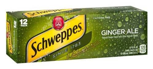 Natural ginger flavor with other natural flavors. Caffeine free. Since 1783. 120 calories per can. Please recycle. • Brand: Schweppes • Flavor: Ginger ale • Pack size: 12 • Packaging: Reusable