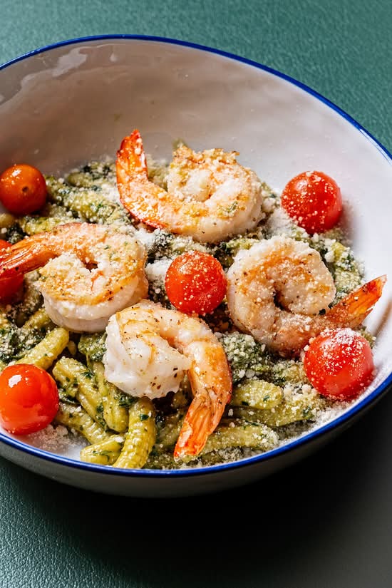 Homemade cavatelli pesto, tossed in our pesto sauce, grilled shrimp