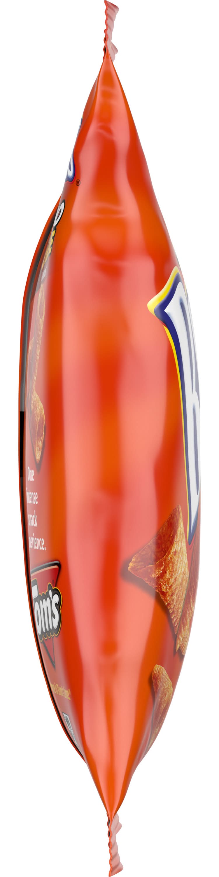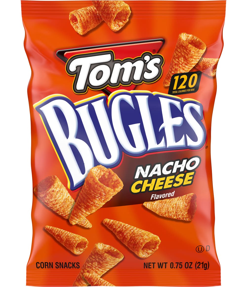 Get ready for a big blast of nacho cheese flavor goodness! Behind the irresistible crunch of Tom's Bugles corn snacks is a hearty punch of big cheese bang! Anytime Is Tom's Time.