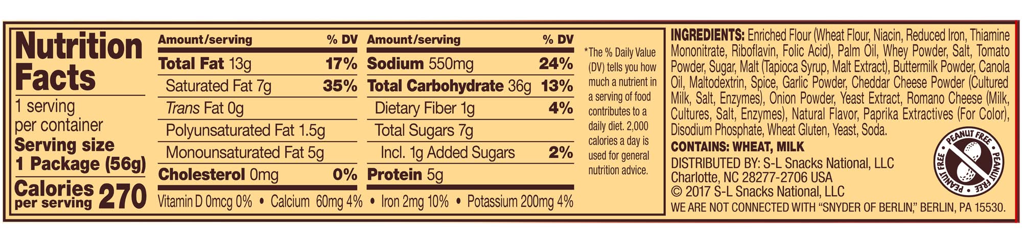 Ingredients: INGREDIENTS: Enriched Flour (Wheat Flour, Niacin, Reduced Iron, Thiamine Mononitrate, Riboflavin, Folic Acid), Palm Oil, Whey Powder, Salt, Tomato Powder, Sugar, Malt (Tapioca Syrup, Malt Extract), Buttermilk Powder, Canola Oil, Maltodextrin, Spice, Garlic Powder, Cheddar Cheese Powder (Cultured Milk, Salt, Enzymes), Onion Powder, Yeast Extract, Romano Cheese (Milk, Cultures, Salt, Enzymes), Natural Flavor, Paprika Extractives (For Color), Disodium Phosphate, Wheat Gluten, Yeast, Soda. CONTAINS: WHEAT, MILK. Contains: CONTAINS: Gluten, Milk/Dairy, Wheat