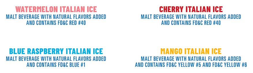 Ingredients: Watermelon Italian Ice: Malt Beverage with Natural Flavors Added and Contains FD&C Red 40. Cherry Italian Ice: Malt Beverage with Natural Flavors Added and Contains FD&C Red 40. Blue Raspberry Italian Ice: Malt Beverage with Natural Flavors Added and Contains FD&C Blue 1. Mango Italian Ice: Malt Beverage with Natural Flavors Added and Contains FD&C Yellow 5 and FD&C Yellow 6.