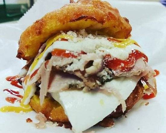 arepa rebosada, de Carne mechada, pollo o pernil con mortadela, repollo, salsas y queso parmesano