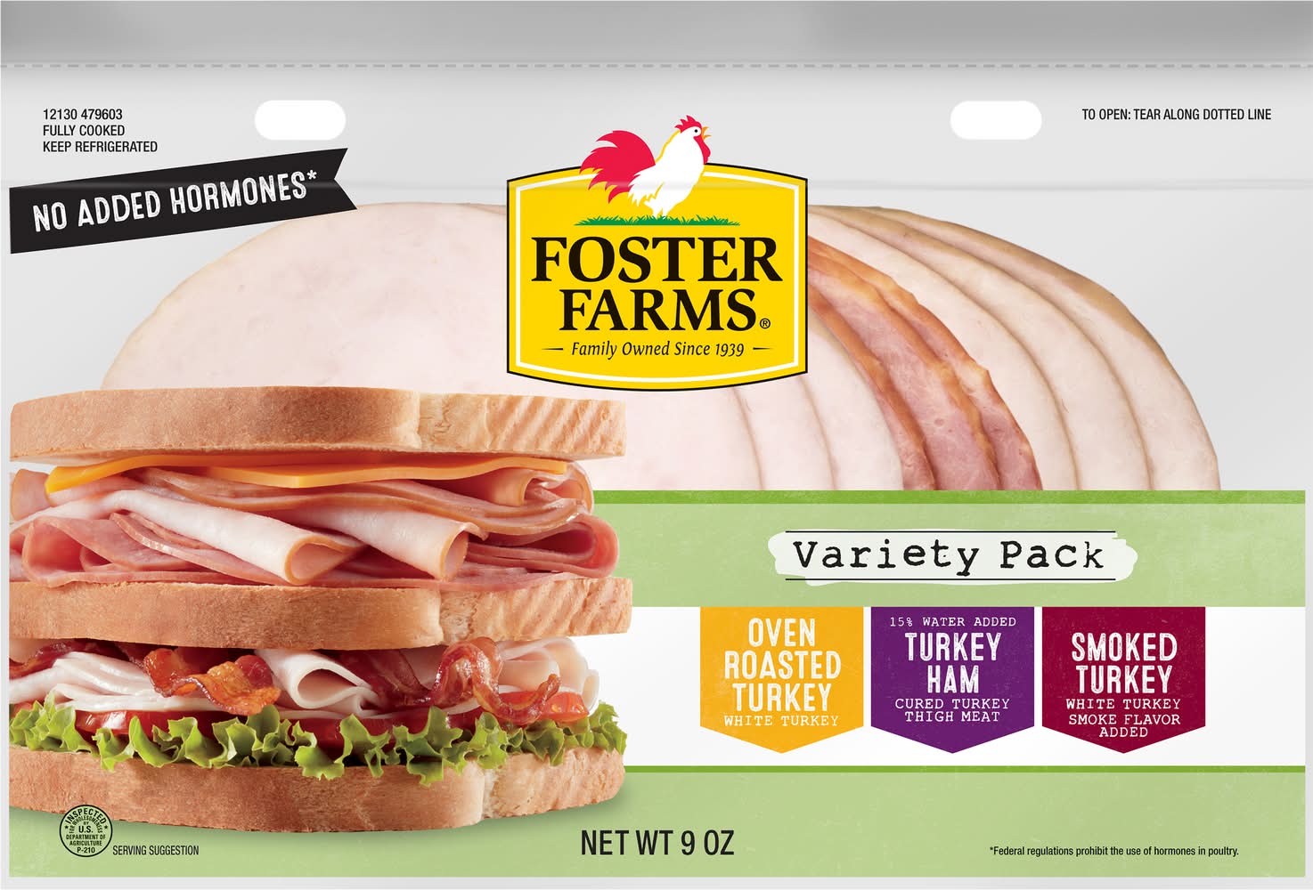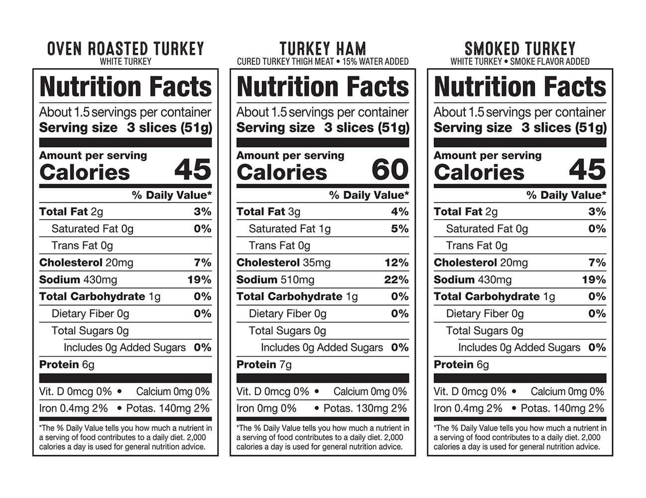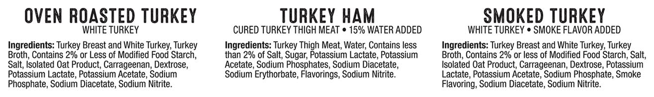 Ingredients: Oven Roasted Turkey: Turkey Breast and White Turkey, Turkey Broth, Contains 2% or Less of Modified Food Starch, Salt, Isolated Oat Product, Carrageenan, Dextrose, Potassium Lactate, Potassium Acetate, Sodium Phosphate, Sodium Diacetate, Sodium Nitrite. Smoked Turkey: Turkey Breast and White Turkey, Turkey Broth, Contains 2% or Less of Modified Food Starch, Salt, Isolated Oat Product, Carrageenan, Dextrose, Potassium Lactate, Potassium Acetate, Sodium Phosphate, Smoke Flavoring, Sodium Diacetate, Sodium Nitrite. Turkey Ham: Turkey Thigh Meat, Water, Contains Less than 2% of Salt, Sugar, Potassium Lactate, Potassium Acetate, Sodium Phosphates, Sodium Diacetate, Sodium Erythorbate, Flavorings, Sodium Nitrite.