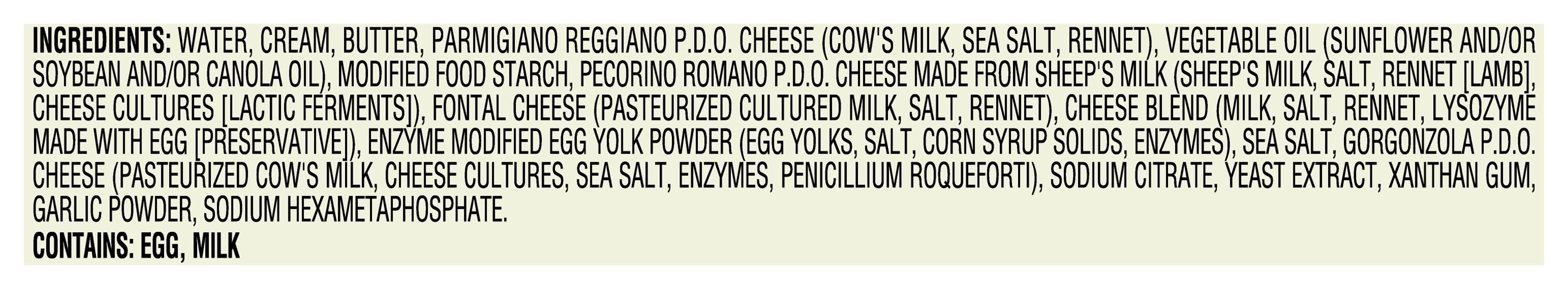 Ingredients: Water, Cream, Butter, Sunflower Oil, Parmigiano Reggiano PDO Cheese (Milk, Sea Salt, Enzyme), Modified Corn Starch, Pecorino Romano PDO Cheese Made from Sheep's Milk (Sheep's Milk, Salt, Enzyme), Fontal Cheese (Pasteurized Milk, Salt, Cheese Cultures, Enzyme), Cheese Blend (Milk, Salt, Enzyme, Lysozyme from Egg [Preservative]), Egg Yolk Powder (Dried Egg Yolk, Salt, Corn Syrup), Salt, Gorgonzola PDO Cheese (Pasteurized Cow's Milk, Cheese Cultures, Sea Salt, Enzymes, Penicillium Roqueforti), Sodium Citrate, Xanthan Gum, Yeast Extract, Garlic Powder, Sodium Phosphate Contains: Milk, Corn, Eggs