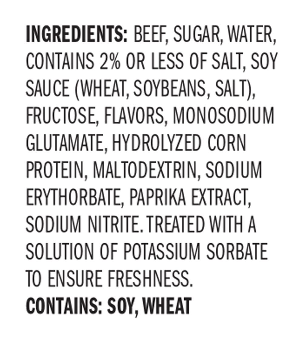 Ingredients: BEEF, SUGAR, WATER, CONTAINS 2% OR LESS OF SALT, SOY SAUCE (WHEAT, SOYBEANS, SALT), FRUCTOSE, FLAVORS, MONOSODIUM GLUTAMATE, HYDROLYZED CORN PROTEIN, MALTODEXTRIN, SODIUM ERYTHORBATE, PAPRIKA EXTRACT, SODIUM NITRITE. TREATED WITH A SOLUTION OF POTASSIUM SORBATE TO ENSURE FRESHNESS Contains: Wheat, Soybean