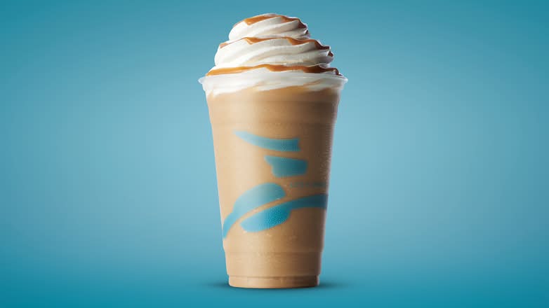 Coffee blended with ice and caramel flavor. Topped with whipped cream and caramel drizzle.