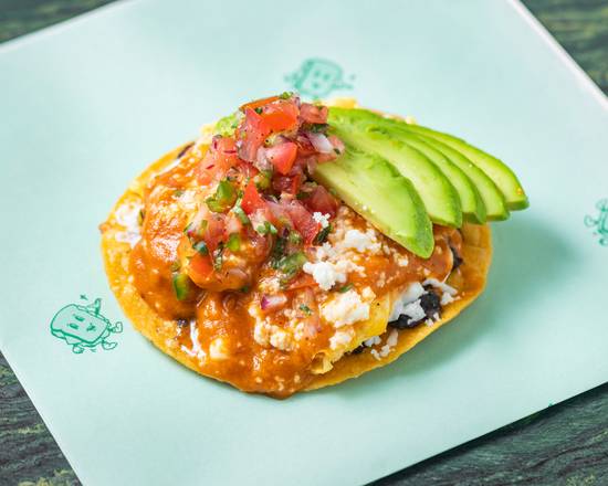 Handheld corn tostada, smashed black beans topped with melted Oaxaca cheese, cheesy scrambled eggs, ranchero sauce, pico de gallo, and micro cilantro. Finished with Queso Fresco.