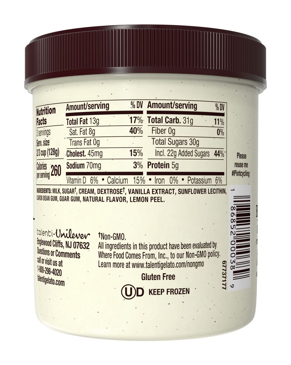 Recipe 2: Slow cooked creamy vanilla gelato with Madagascan vanilla beans. Certified gluten free. gfco.org. Gelato & Sorbetto. talentigelato.com. how2recycle.info. SmartLabel: App enabled. Questions or Comments: Call or visit us at 1-800-298-4020; talentigelato.com. For information on Talenti's ingredient sourcing policy please visit www.talentigelato.com/ingredient-sourcing. • Flavor: Madagascar vanilla bean • Packaging: Reusable