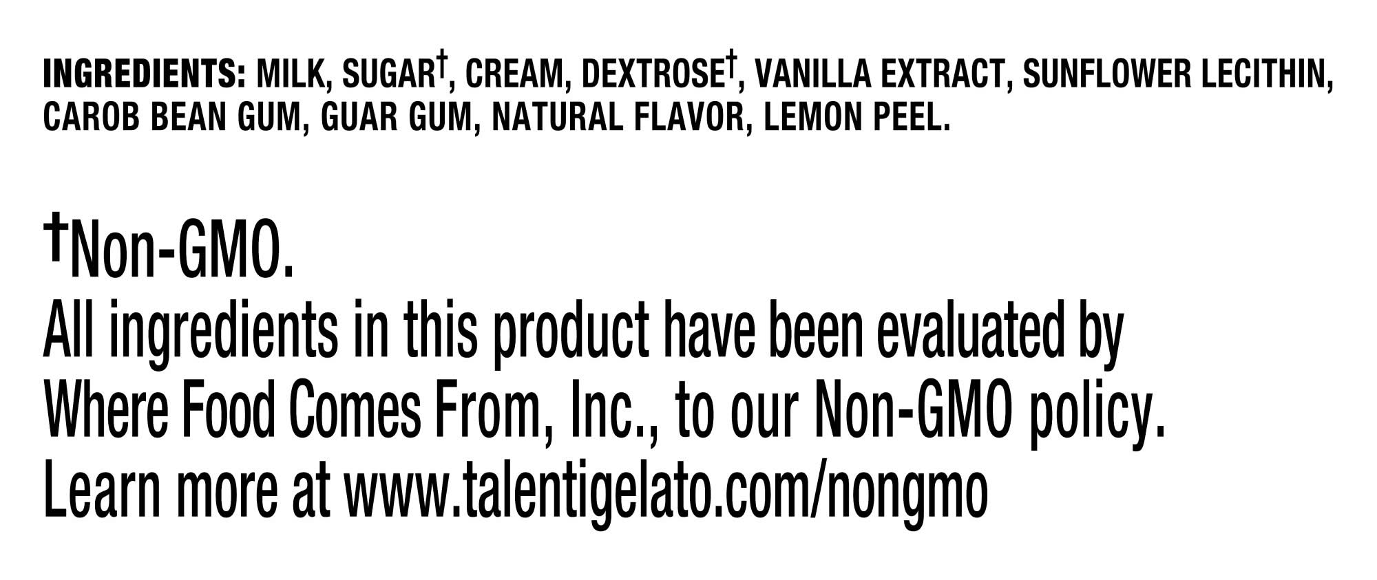 Ingredients: Milk, Sugar Non-GMO, Cream, Dextrose Non-GMO, Vanilla Extract, Sunflower Lecithin, Carob Bean Gum, Guar Gum, Natural Flavor, Lemon Peel. Contains: Milk