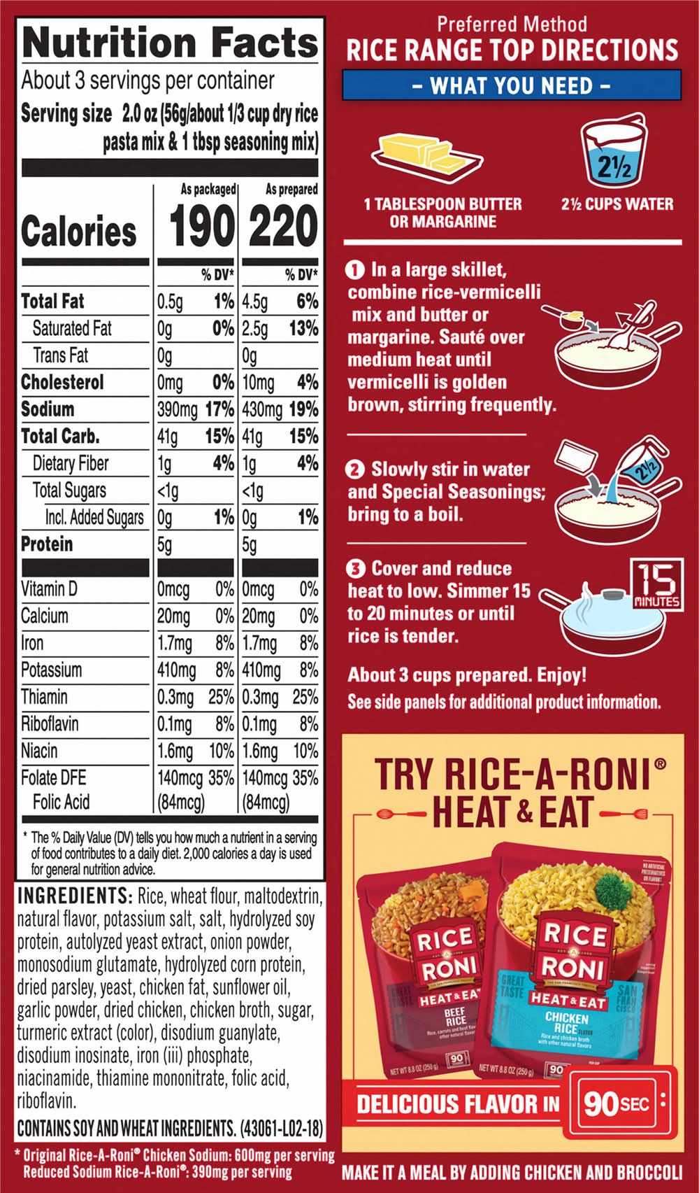 Ingredients: Rice, Wheat Flour, Maltodextrin, Natural Flavor, Potassium Salt, Salt, Hydrolyzed Soy Protein, Autolyzed Yeast Extract, Onion Powder, Monosodium Glutamate, Hydrolyzed Corn Protein, Dried Parsley, Yeast, Chicken Fat, Sunflower Oil, Garlic Powder, Dried Chicken, Chicken Broth, Sugar, Turmeric Extract (Color), Disodium Guanylate, Disodium Inosinate, Iron (iii) Phosphate, Niacinamide, Thiamine Mononitrate, Folic Acid, Riboflavin Contains: Soybeans, Wheat, Corn