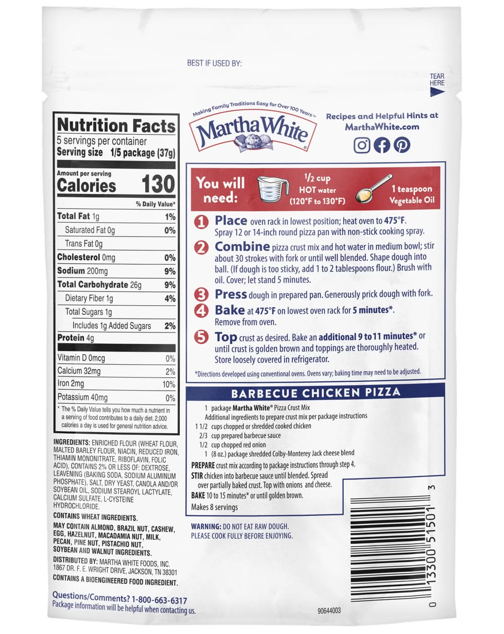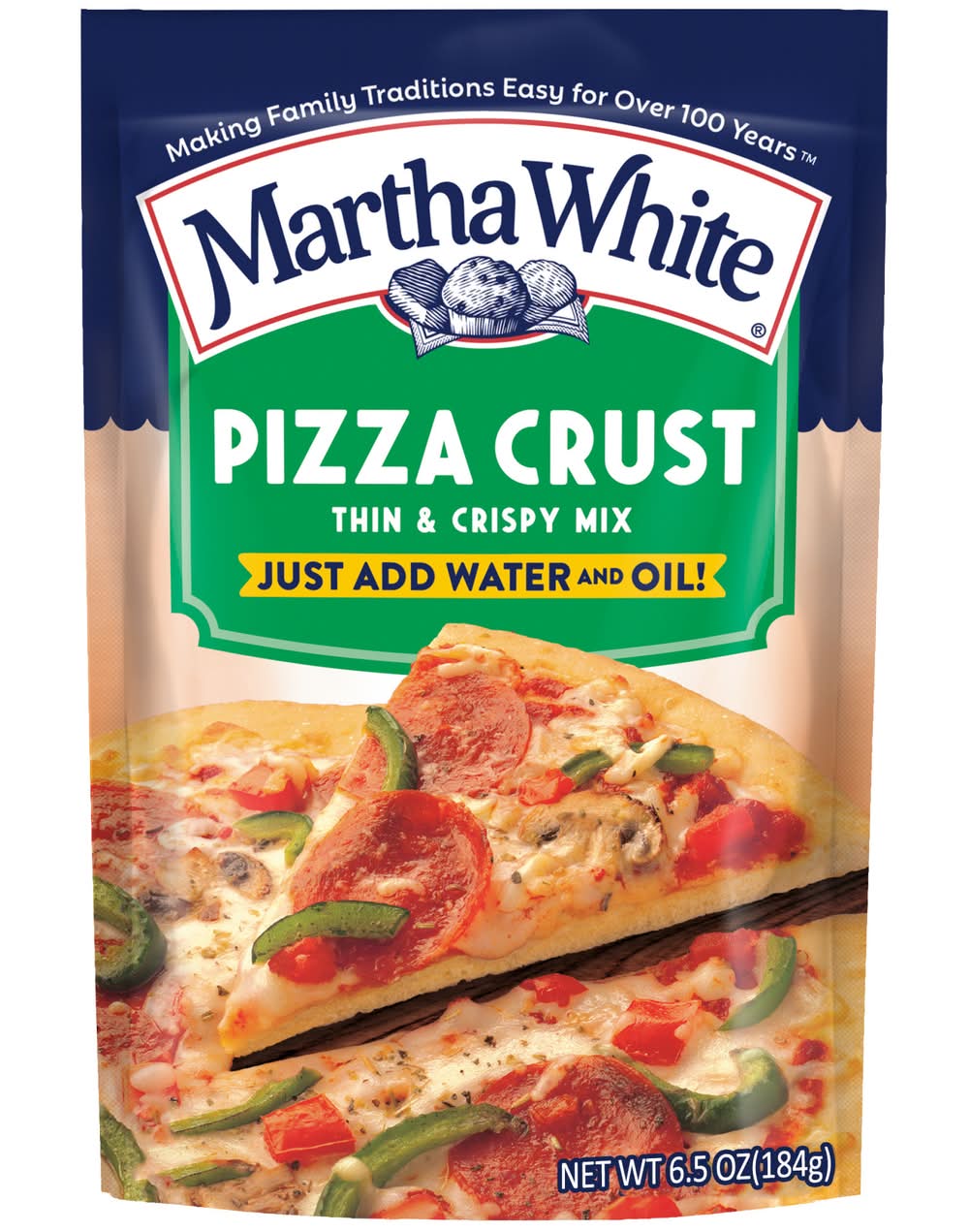 Martha White Pizza Crust Thin & Crispy Mix offers a simple way to create homemade pizza crusts with a thin and crispy texture. Each 6.5 oz package contains ingredients that require only the addition of water and oil to prepare. The mix contains 160 calories per quarter package serving, with no saturated fat, 250 mg of sodium, and 1 gram of total sugars. Established in 1899, the brand has been providing quality products for over a century. Martha White Foods, Inc., PO Box 751030,Memphis,TN,38175