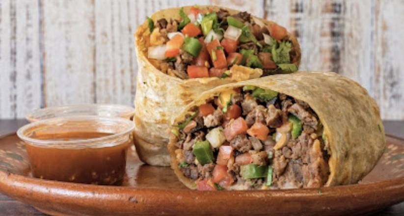 Mexican burrito with choice of protein: Al Pastor, Barbacoa, Carne Asada, Carnitas, or Chicharron. Wrapped in a soft tortilla.