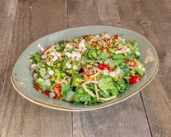 Romaine, roasted corn, tomato, edamame, queso fresco, wontons, and garlic herb vinaigrette.