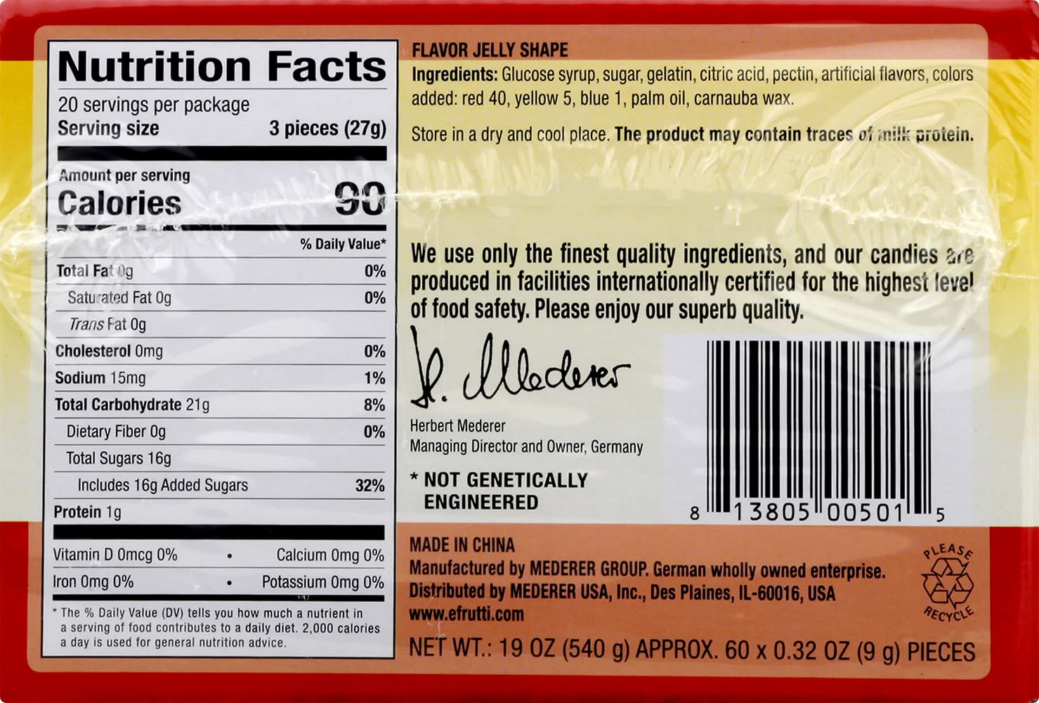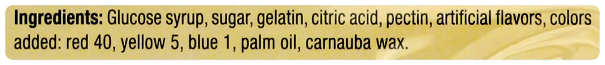 Ingredients: Glucose Syrup, Sugar, Gelatin, Citric Acid, Pectin, Artificial Flavors, Colors Added: Red 40, Yellow 5, Blue 1, Palm Oil, Carnauba Wax Contains: Milk