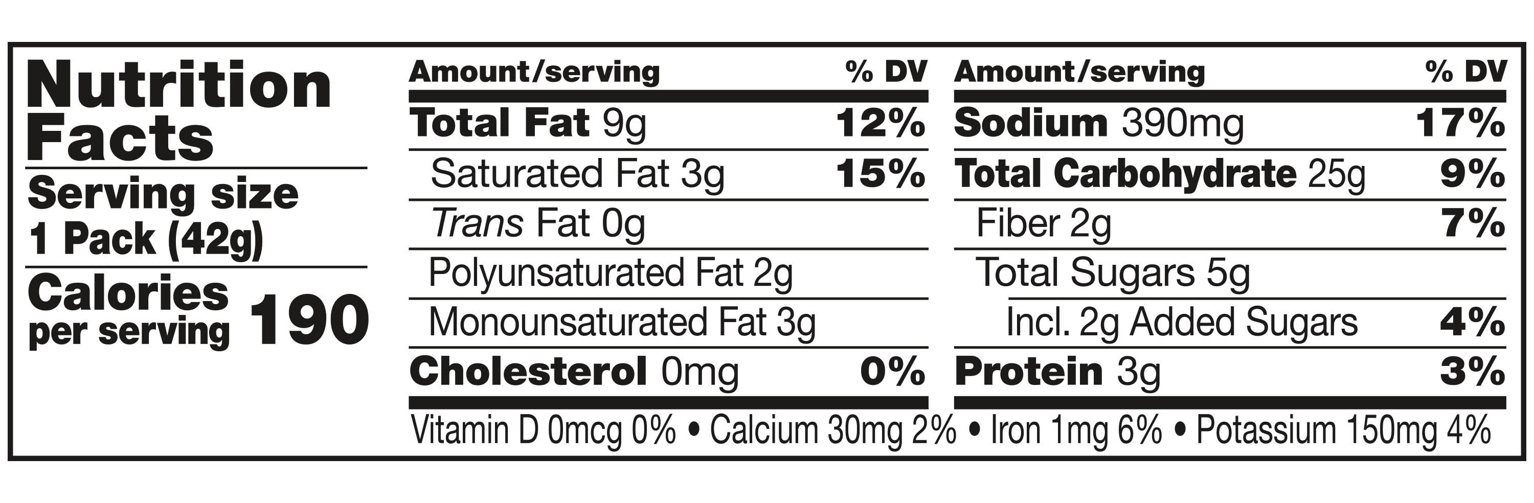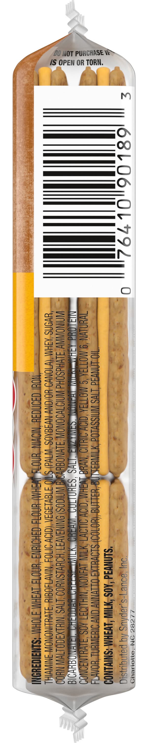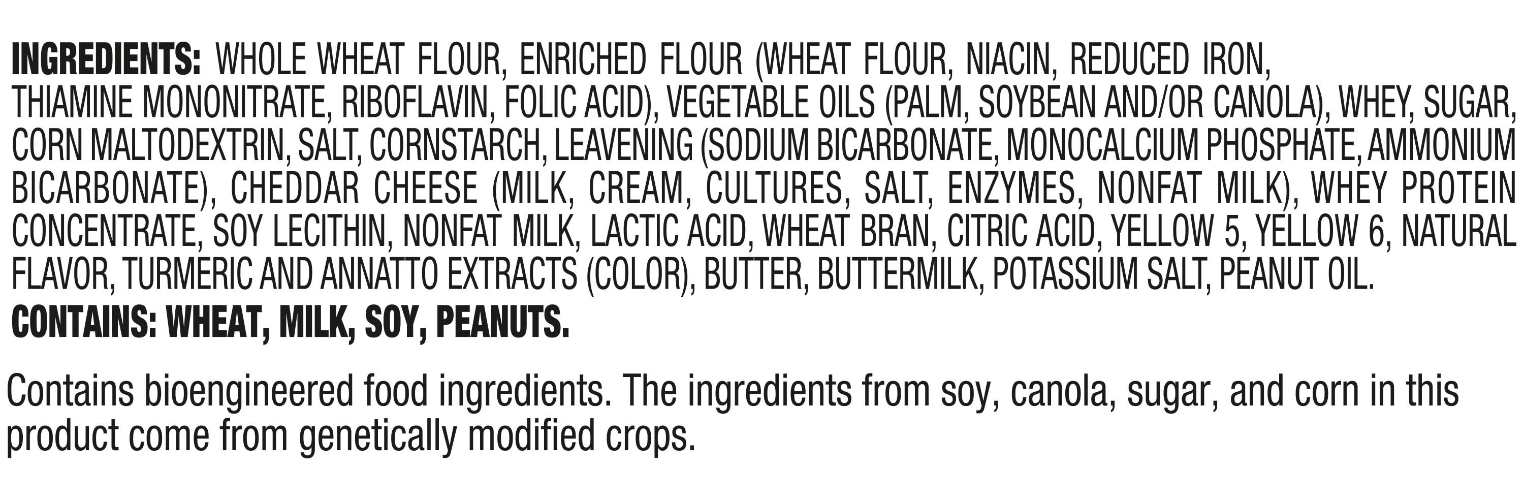 Ingredients: INGREDIENTS: WHOLE WHEAT FLOUR, ENRICHED FLOUR (WHEAT FLOUR, NIACIN, REDUCED IRON, THIAMINE MONONITRATE, RIBOFLAVIN, FOLIC ACID), VEGETABLE OILS (PALM, SOYBEAN AND/OR CANOLA), WHEY, SUGAR, CORN MALTODEXTRIN, SALT, CORNSTARCH, LEAVENING (SODIUM BICARBONATE, MONOCALCIUM PHOSPHATE, AMMONIUM BICARBONATE), CHEDDAR CHEESE (MILK, CREAM, CULTURES, SALT, ENZYMES, NONFAT MILK), WHEY PROTEIN CONCENTRATE, SOY LECITHIN, NONFAT MILK, LACTIC ACID, WHEAT BRAN, CITRIC ACID, YELLOW 5, YELLOW 6, NATURAL FLAVOR, TURMERIC AND ANNATTO EXTRACTS (COLOR), BUTTER, BUTTERMILK, POTASSIUM SALT, PEANUT OIL. CONTAINS: WHEAT, MILK, SOY, PEANUTS. Contains: CONTAINS: Gluten, Milk/Dairy, Peanut, Soybean, Wheat