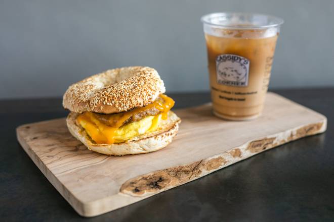 Egg cheese, choice of bacon, sausage, or ham choice of small orange juice or small coffee.