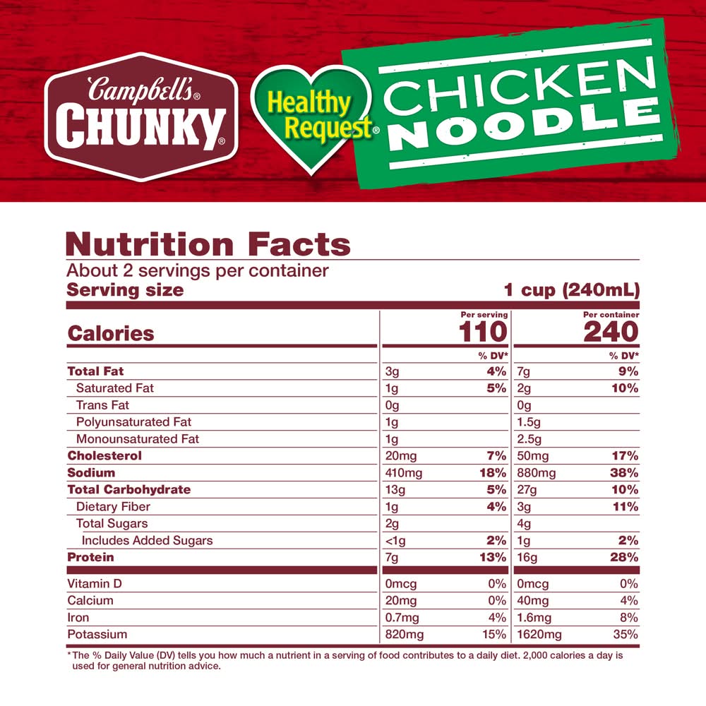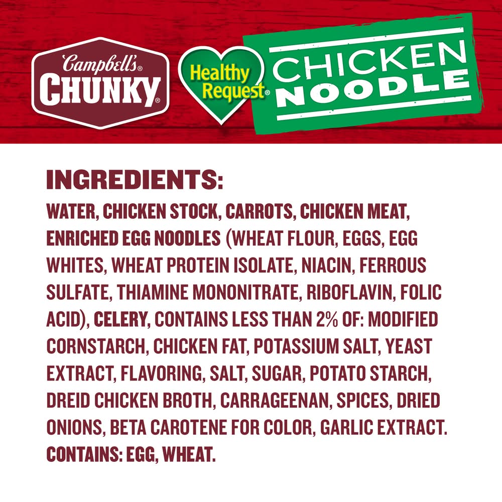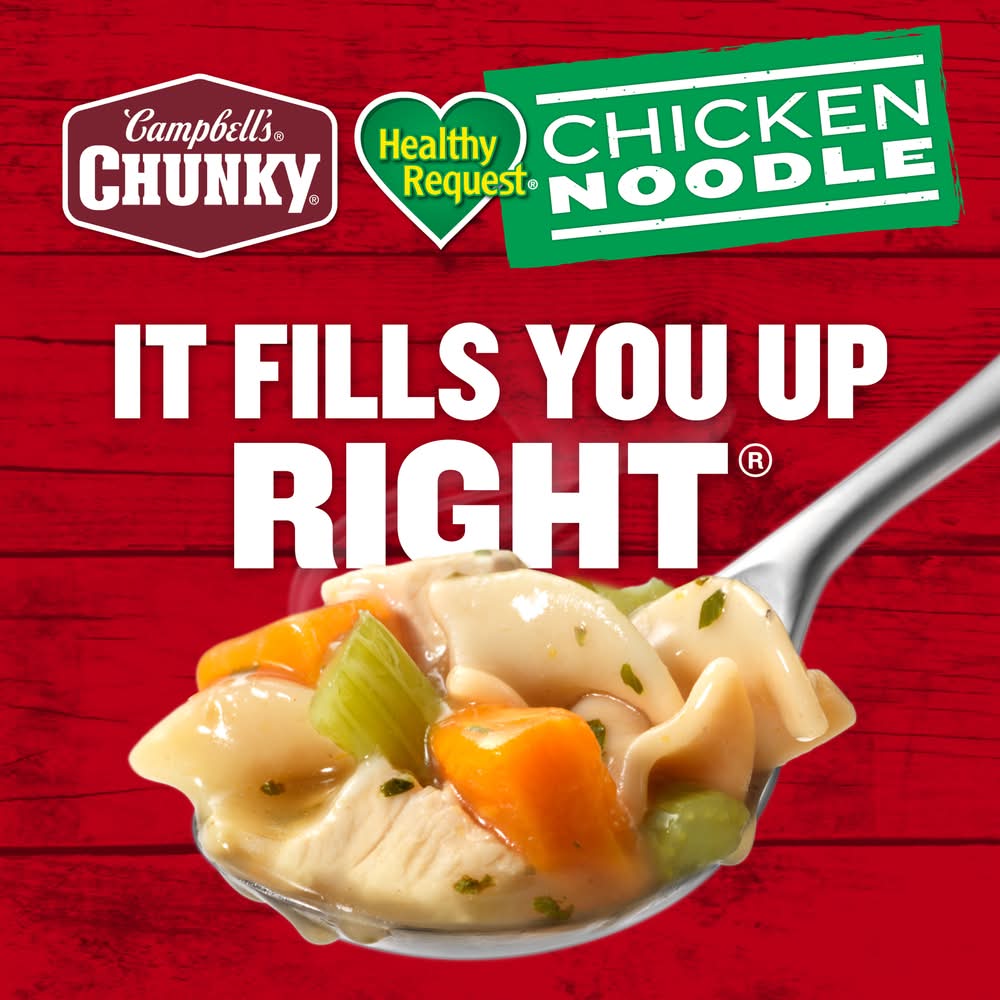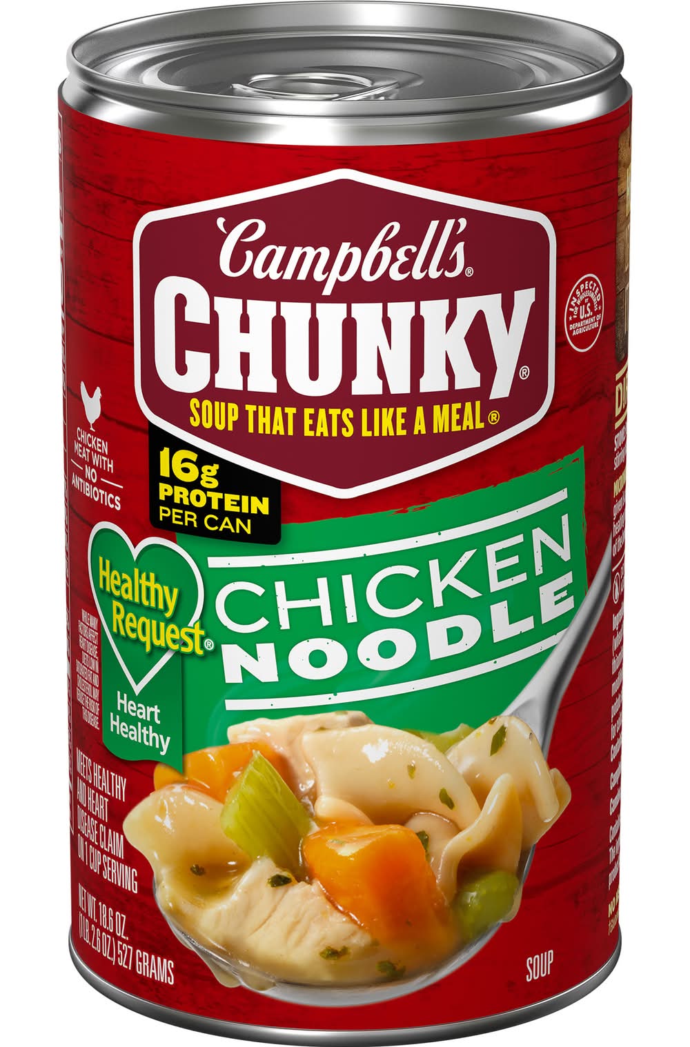Tackle your hunger with Campbell's Chunky Healthy Request Chicken Noodle Soup. This heart-healthy chicken soup features big pieces of white chicken meat with no antibiotics plus carrots, celery, and enriched egg noodles for a comforting taste that's just like mom used to make. With 16g of protein per can, it's a satisfying chicken noodle soup that fuels even the heartiest of appetites. Campbell's Chunky Soup is a year-round pantry staple and the MVP of game day snacks, delivering a winning combination of flavor and convenience. Enjoy a warm bowl of this canned soup when watching the game from home, or savor it at your next tailgating event. To prepare the microwave soup, simply pour into a microwave-safe bowl and heat — do not add water. Or heat in a saucepan on the stove, stirring occasionally. Whether you're a football fan or simply craving something hearty, Campbell's Chunky Healthy Request Chicken Noodle Soup will keep you feeling full and satisfied from kickoff to the final whistle. Make every game day a winner with Campbell's Chunky – Soup That Eats Like a Meal. (While many factors affect heart disease, diets low in saturated fat and cholesterol may reduce the risk of this disease; meets healthy and heart disease claim on 1-cup serving) Campbell soup company, Camden,NJ,08103-1701,USA