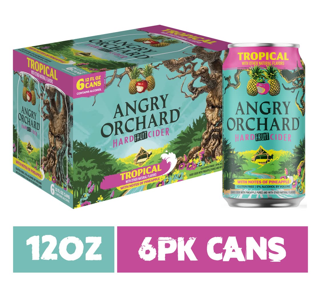 Tropical Fruit Hard Cider • Pack size: 6 • Alcohol by volume: 5% • Angry Orchard Cider Company, Llc., 2241 Albany Post Rd, Walden, Ny 12586. • Packaging: Reusable