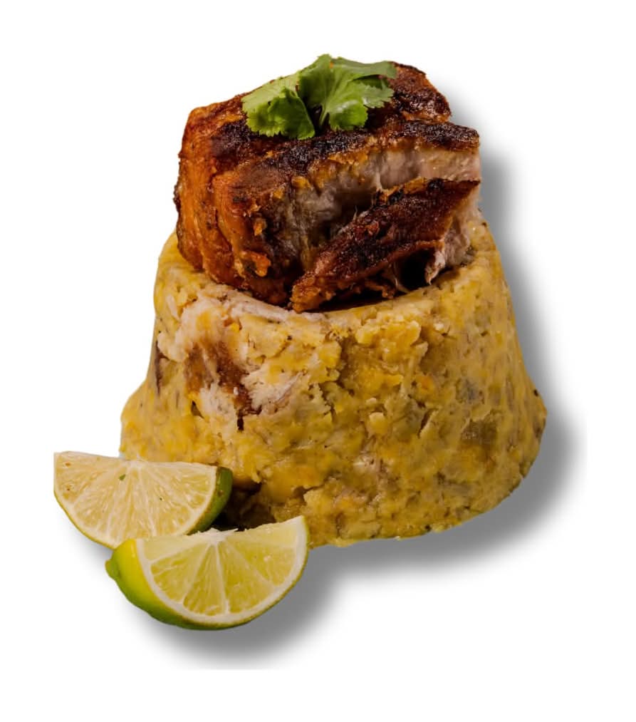 A traditional Caribbean dish made with mashed green plantains mixed with garlic and crispy pork rinds.