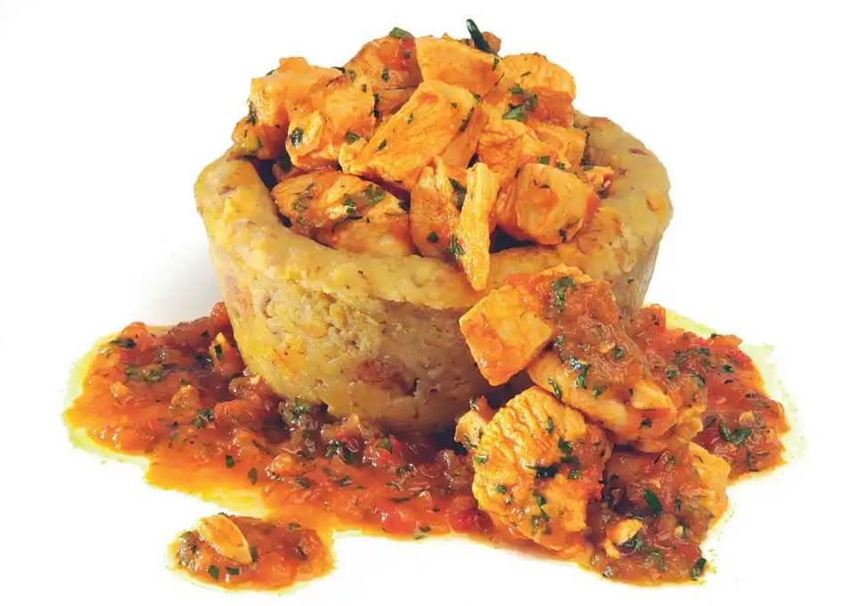 A savory dish made with mashed green plantains, perfectly seasoned and mixed with garlic and crispy pork cracklings, then topped with tender, flavorful chicken.