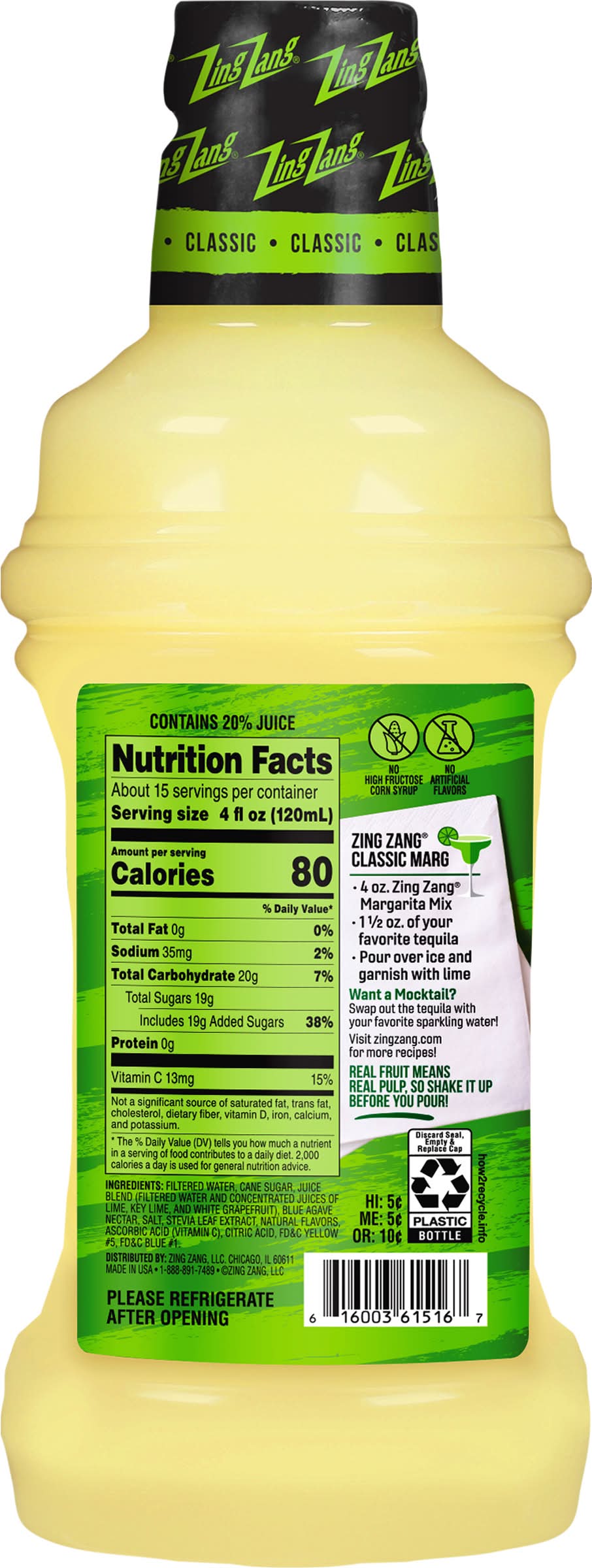 Directions for use: Shake well before using! Zing Zang Classic Margarita: 4 oz Zing Zang Margarita Mix 1-1/2 oz your favorite tequila. Pour over ice and garnish with lime. Zing zang cadillac margarita. 3 oz zing zang margarita mix 1 1/2 oz favorite tequila; 1 oz grand marnier; pour over ice & garnish with orange zest.Refrigerate after opening. Storage recommendation: Refrigerate after opening.