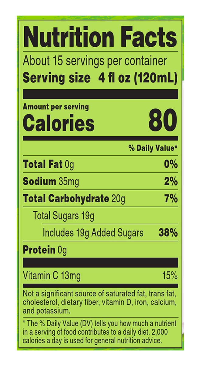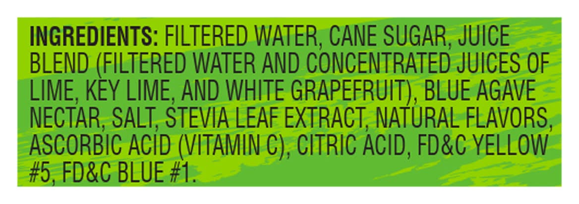 Ingredients: Filtered Water, Cane Sugar, Juice Blend (Filtered Water and Concentrated Juices of Lime, Key Lime, and White Grapefruit), Blue Agave Nectar, Salt, Stevia Leaf Extract, Natural Flavors, Ascorbic Acid (Vitamin C), Citric Acid, FD&C Yellow #5, FD&C Blue #1
