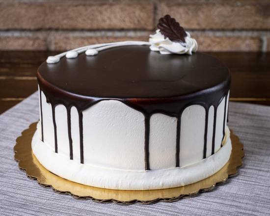 2 layers of vanilla cake with one layer of chocolate cake, filled with chocolate buttercream frosted with vanilla buttercream and covered in chocolate icing.
