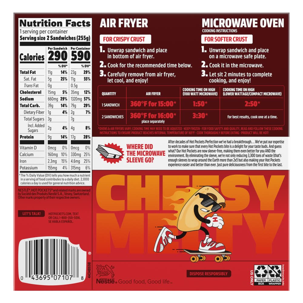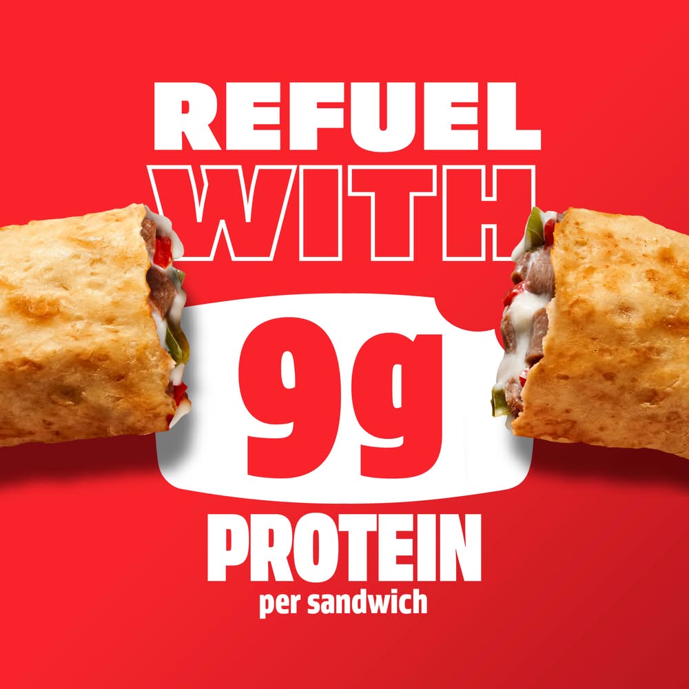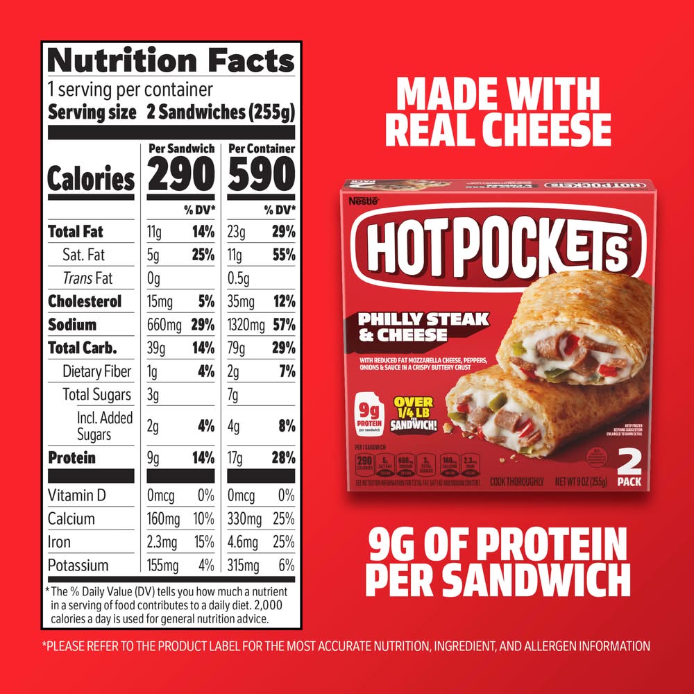Dive into the cheesy, saucy and savory world of snacking with Hot Pockets frozen snacks. These indulgent Philly cheese steak Hot Pockets aren’t your average frozen lunch snack. Hot Pockets sandwiches are hunger’s worst nightmare, delivering the bold flavors of Philly steak, reduced fat mozzarella cheese, peppers, onions and sauce in a hearty microwaveable snack. Great for gaming all night, a quick snack after school or a quick bite before heading out the door, Hot Pockets are perfect for any occasion. These frozen sandwiches are a good source of protein with 9 grams per sandwich. Cook this microwave food for 1 minute, 50 seconds on high and let cool for 2 minutes for an on-the-go snack. Air fry at 360 degrees Fahrenheit for 15 minutes. Hot Pockets sandwiches are hot and delicious every time. Keep Hot Pockets sandwiches frozen until ready to cook and eat. Packaging: Reusable