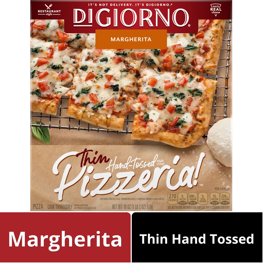 DiGiorno Pizzeria! Margherita Frozen Pizza on a Thin Hand-Tossed Style Crust is created with extra vigin olive oil and a flavorful sauce made with vine-ripened tomatoes. This thin crust frozen pizza is topped with real mozzarella cheese, juicy tomatoes and basil on a thin, hand tossed style crust, delivering restaruant quality at home. The hand tossed pizza offers a thin crust with a crispy texture and a delightful crunch. This cook and serve frozen thin crust pizza is made with 100% real cheese and DiGiorno signature tomato sauce. Step up your frozen family dinner with a premium frozen margherita pizza on busy weeknights, or enjoy a DiGiorno pizza party with family or friends. Keep this DiGiorno frozen pizza in the freezer until you're ready to enjoy. It's not delivery, it's DiGiorno. • Number of servings: 4 • Nestle USA Inc, Solon, OH, 44139, Ph: 800-708-5580. • Packaging: Reusable