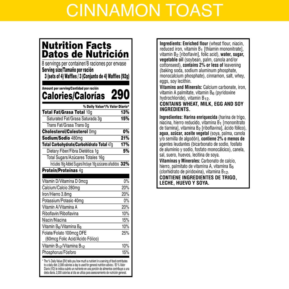 Ingredients: Enriched Flour (Wheat Flour, Niacin, Reduced Iron, Vitamin B1 [Thiamin Mononitrate], Vitamin B2 [Riboflavin], Folic Acid), Water, Sugar, Vegetable Oil (Soybean, Palm, Canola And/Or Cottonseed), Contains 2% Or Less Of Leavening (Baking Soda, Sodium Aluminum Phosphate, Monocalcium Phosphate), Cinnamon, Salt, Whey, Eggs, Soy Lecithin. Vitamins And Minerals: Calcium Carbonate, Iron, Vitamin A Palmitate, Vitamin B6 (Pyridoxine Hydrochloride), Vitamin B12. Contains: Wheat, Eggs, Milk, Soybeans