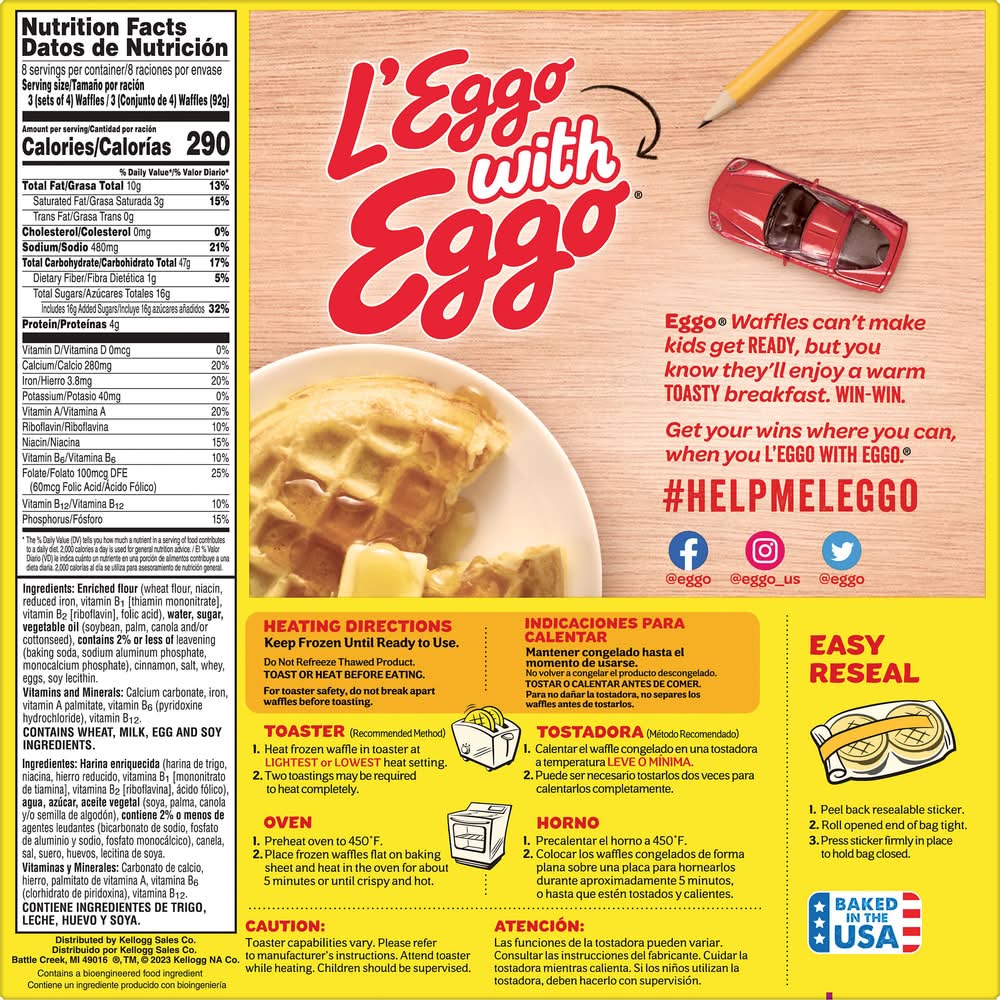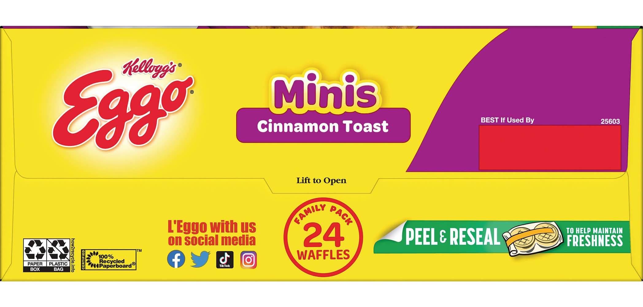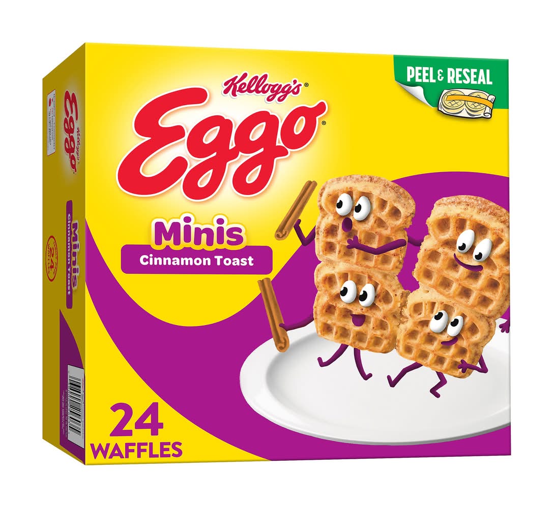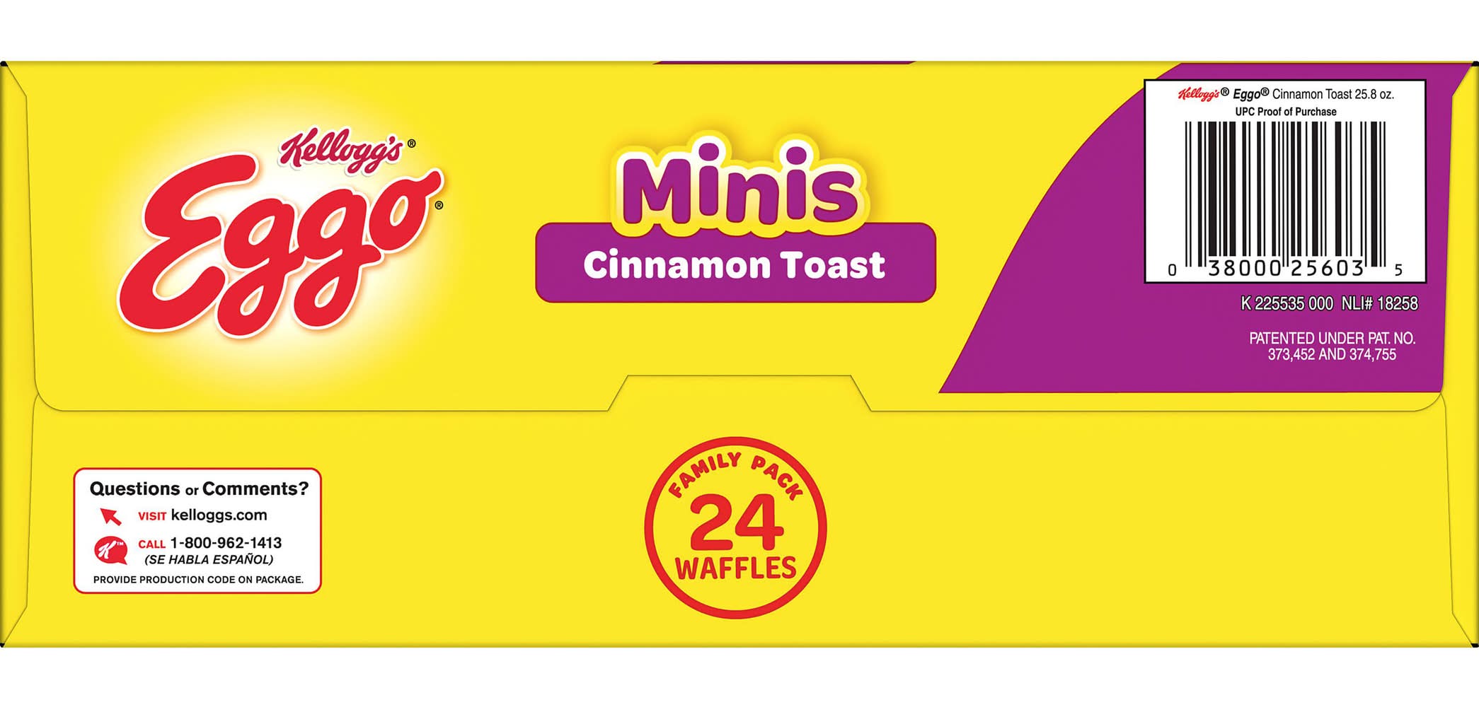 Wake up and greet the day with the feel-good taste of Eggo Minis Cinnamon Toast waffle bites. Crafted with delicious ingredients and the sweet taste of cinnamon, Eggo Minis waffle bites are a perfect balance of crispy, fluffy goodness. They're convenient, easy to prepare, and help bring smiles to fast-paced, busy mornings. Great for families and individuals, these scrumptious waffles are made to enjoy as a part of a balanced breakfast; They pair well with your favorite morning toppings like butter, syrup, jellies, fruit, chocolate or hazelnut spreads, and whipped cream. With no artificial colors or flavors, our waffles also provide a good source of 9 vitamins and minerals. Not just for morning, Eggo Minis waffle bites are great for warm, comforting after-school snacking occasions, late-night treats, and are great for making ice-cream sandwiches. • Flavor: Cinnamon toast • Kellogg Sales Co., Battle Creek,MI,49016 • Packaging: Reusable